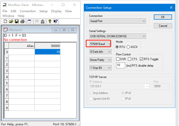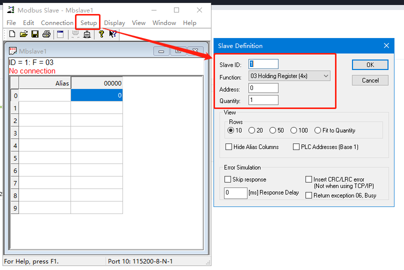 MODBUS SLAVE打開COM10,點擊Setup,Slave ID從機地址用1,Function功能碼用03,Address寄存器起始地址用0,Quantity寄存器地址數量用1。