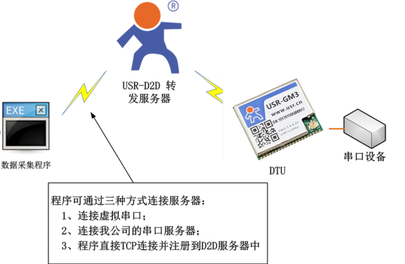 實現:兩個GPRS DTU 模塊都主動去連接D2D轉發服務器,服務器將對兩個GPRS模塊 的串口數據進行轉發。從而實現串口軟件和串口設備或者 串口設備與串口設備之間的串口通信。