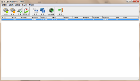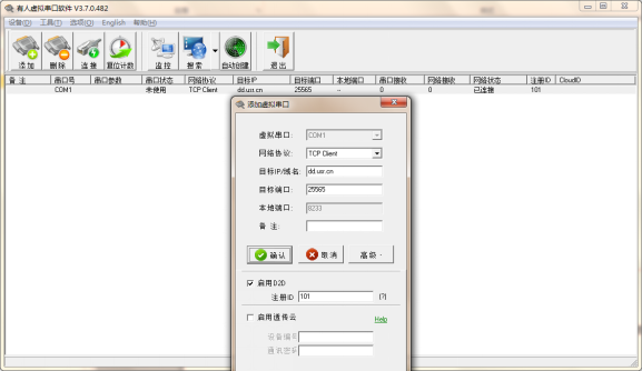 打開設置軟件“添加”選擇虛擬的串口號。網絡協議是TCP Client ,目標地址是dd.usr.cn.目標端口是25565.