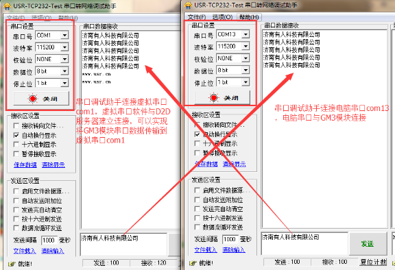 打開串口調試助手軟件,打開兩個窗口界面:一個窗口連接虛擬串口com1.另一個窗口連接電腦串口com13。
