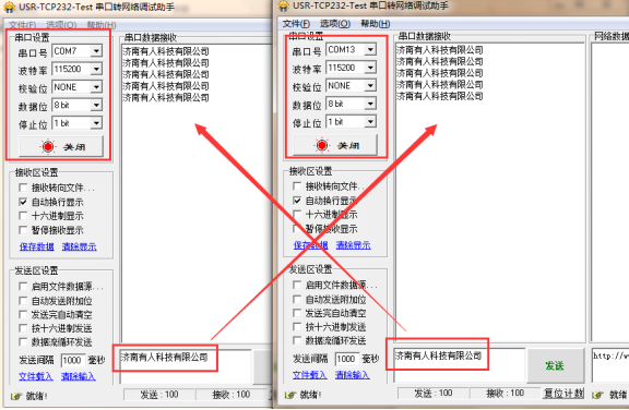 打開串口調試助手軟件,打開兩個窗口界面:一個窗口連接電腦串口com13.另一個窗口連接電腦串口com7。Com13發送的數據com7可以接收。Com7發送的數據com13可以接收。