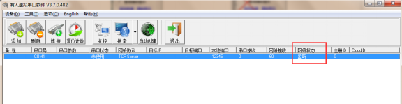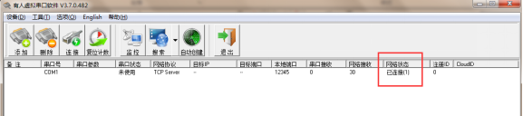 如使用一個GPRS DTU建立連接時會在網絡狀態上顯示已連接(1)。網絡狀態如果一直顯示監聽狀態,請檢查之前設置參數是否有誤,