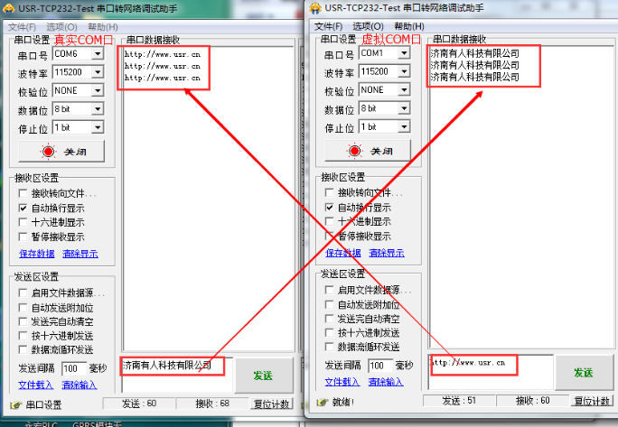 10.使用Test調試助手軟件測試GM3串口到虛擬COM口數據收發情況。