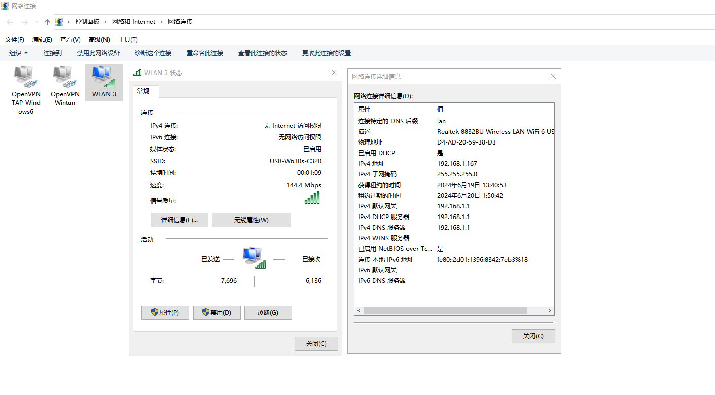 (3)電腦打開控制面板,找到網(wǎng)絡(luò)和Internet,點開網(wǎng)絡(luò)連接,查看無線網(wǎng)卡的狀態(tài),這個是電腦連接USR-W630s的WiFi,USR-W630s分配給電腦的IP。