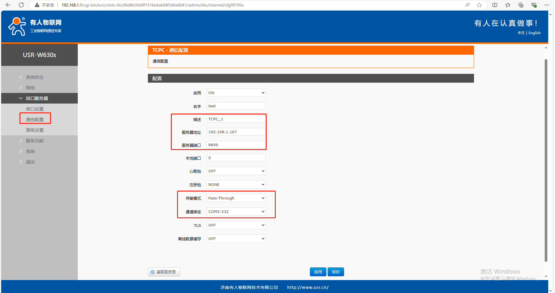 (2)跳轉(zhuǎn)到TCPC-通信配置頁面,服務(wù)器地址填電腦IP 192.168.1.167,服務(wù)器端口填8899,傳輸模式選擇Pass-Through,通道綁定選擇COM2-232。點擊應(yīng)用。