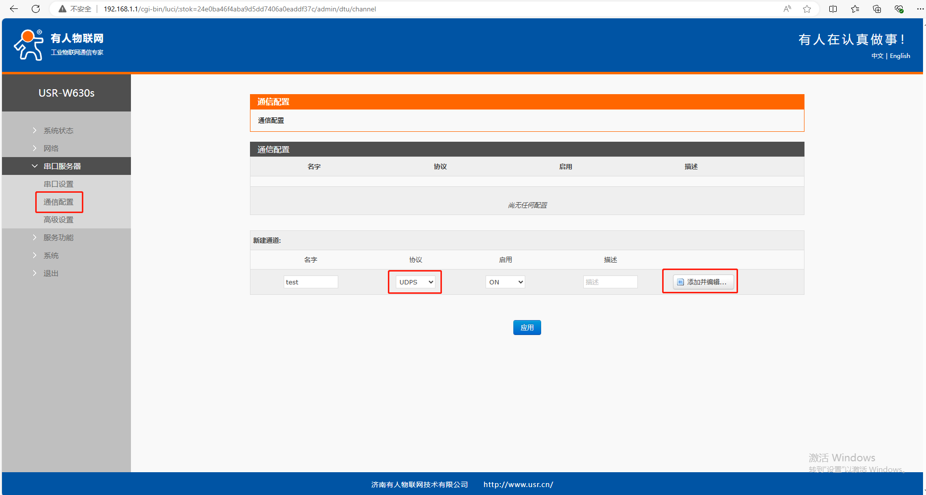 (1)通信配置,新建通道,協(xié)議UDPS,啟用ON,點擊添加并編輯。