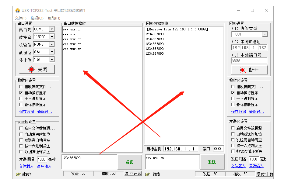 3、測試數(shù)據(jù)通訊,可以先網(wǎng)絡端向串口端發(fā)送數(shù)據(jù),串口端再向網(wǎng)絡端發(fā)送數(shù)據(jù),