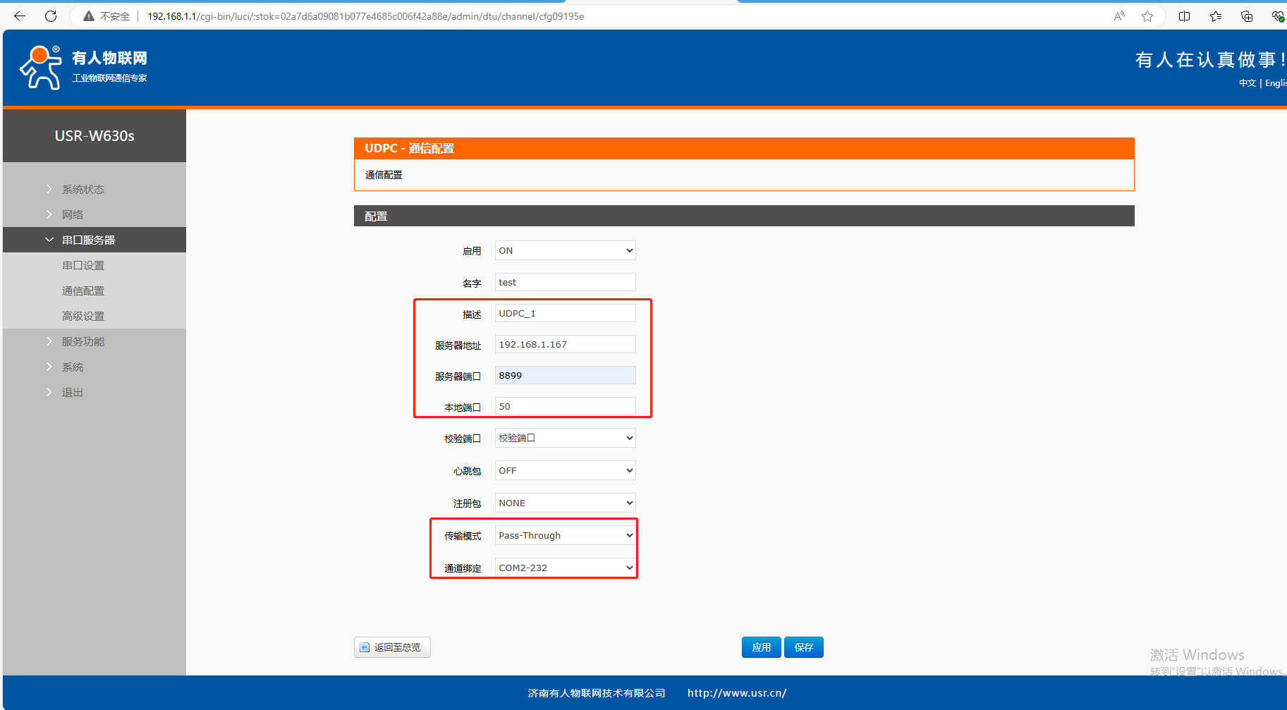 (2)跳轉到UDPC-通信配置頁面,服務器地址填192.168.1.167,服務器端口填8899,本地端口填50,傳輸模式選擇Pass-Through,通道綁定選擇COM2-232。點擊應用。