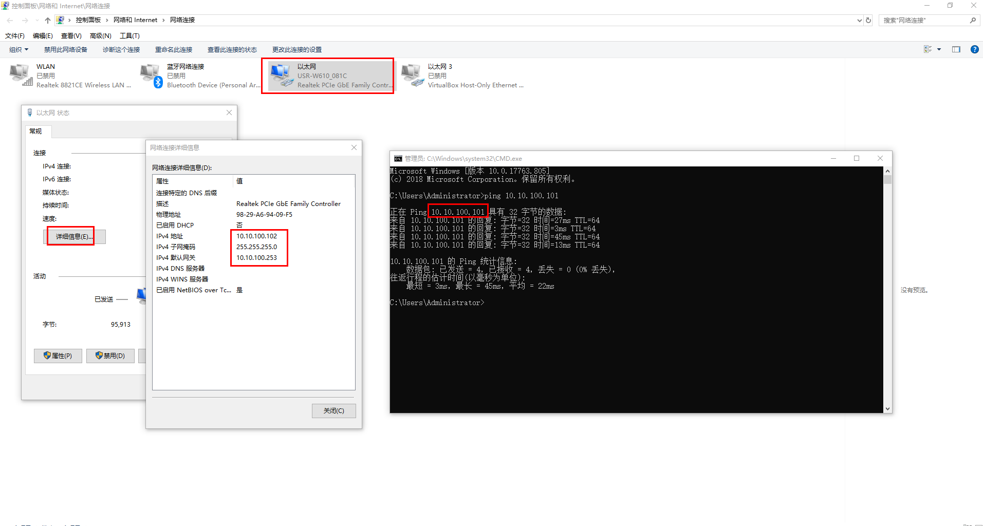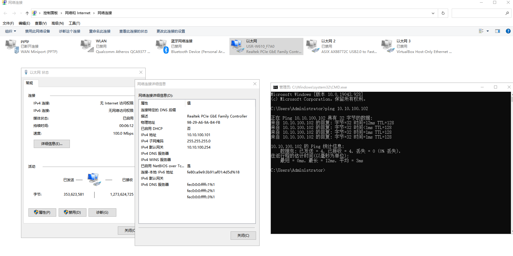 4、打開第2臺(tái)電腦的控制面板,將以太網(wǎng)卡設(shè)置靜態(tài)IP,IPv4設(shè)置10.10.100.102,子網(wǎng)掩碼255.255.255.0,默認(rèn)網(wǎng)關(guān)10.10.100.253,點(diǎn)擊確定。