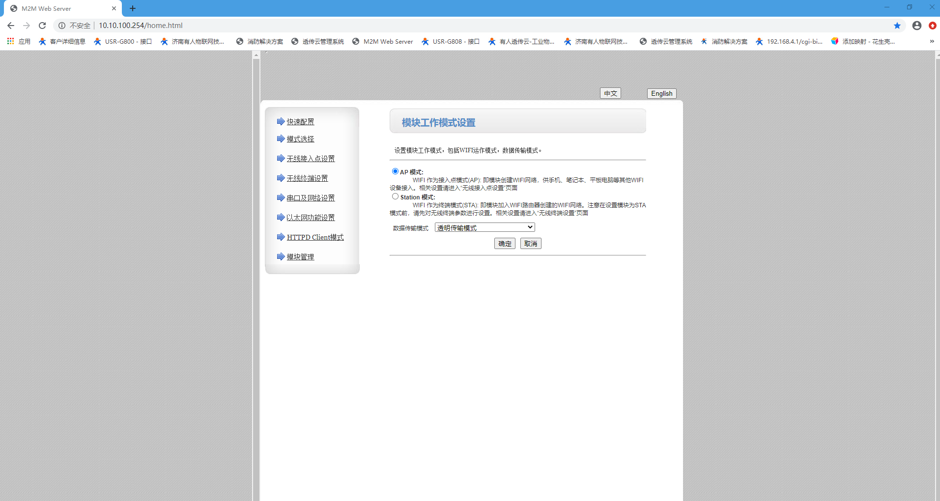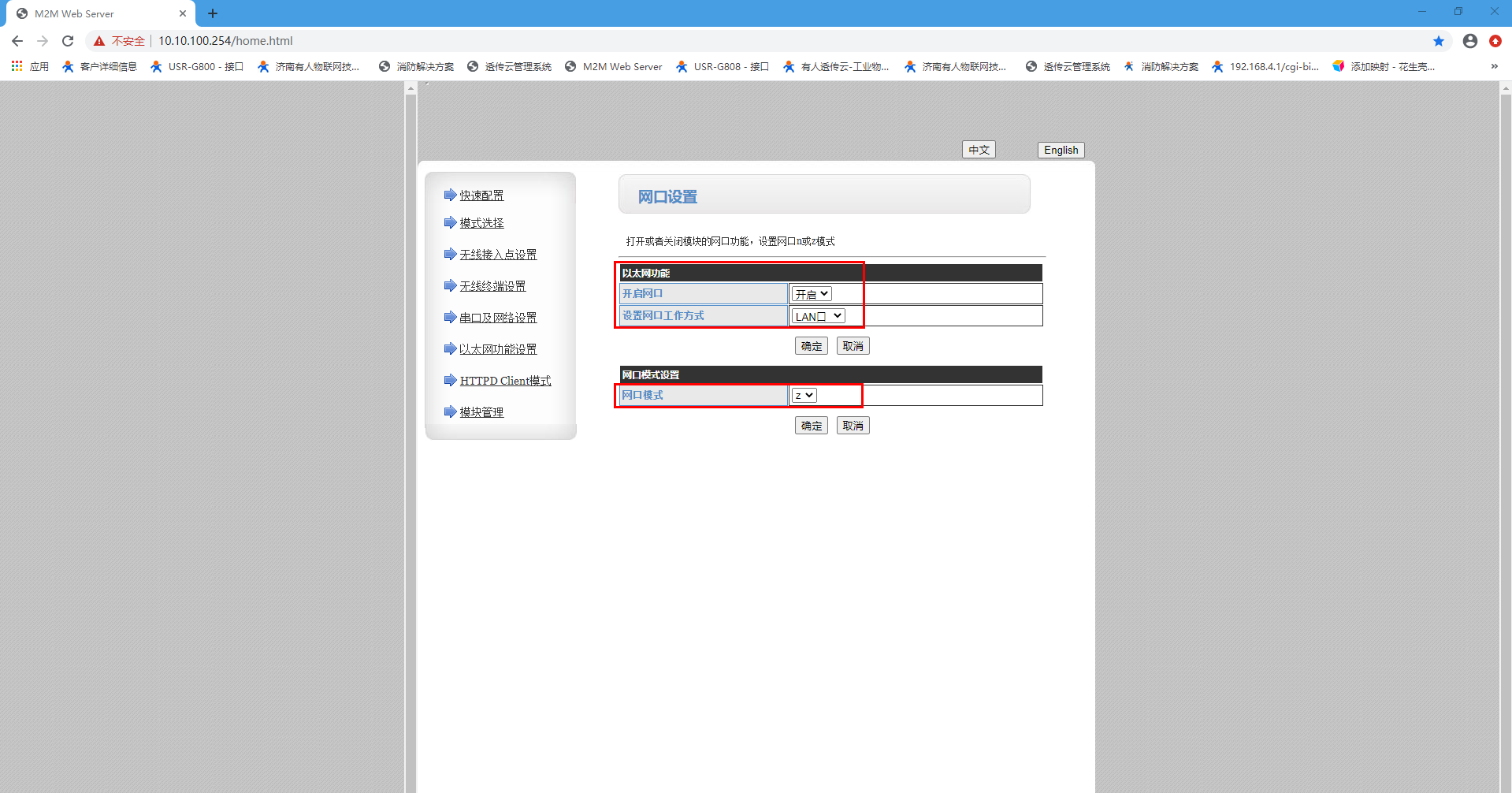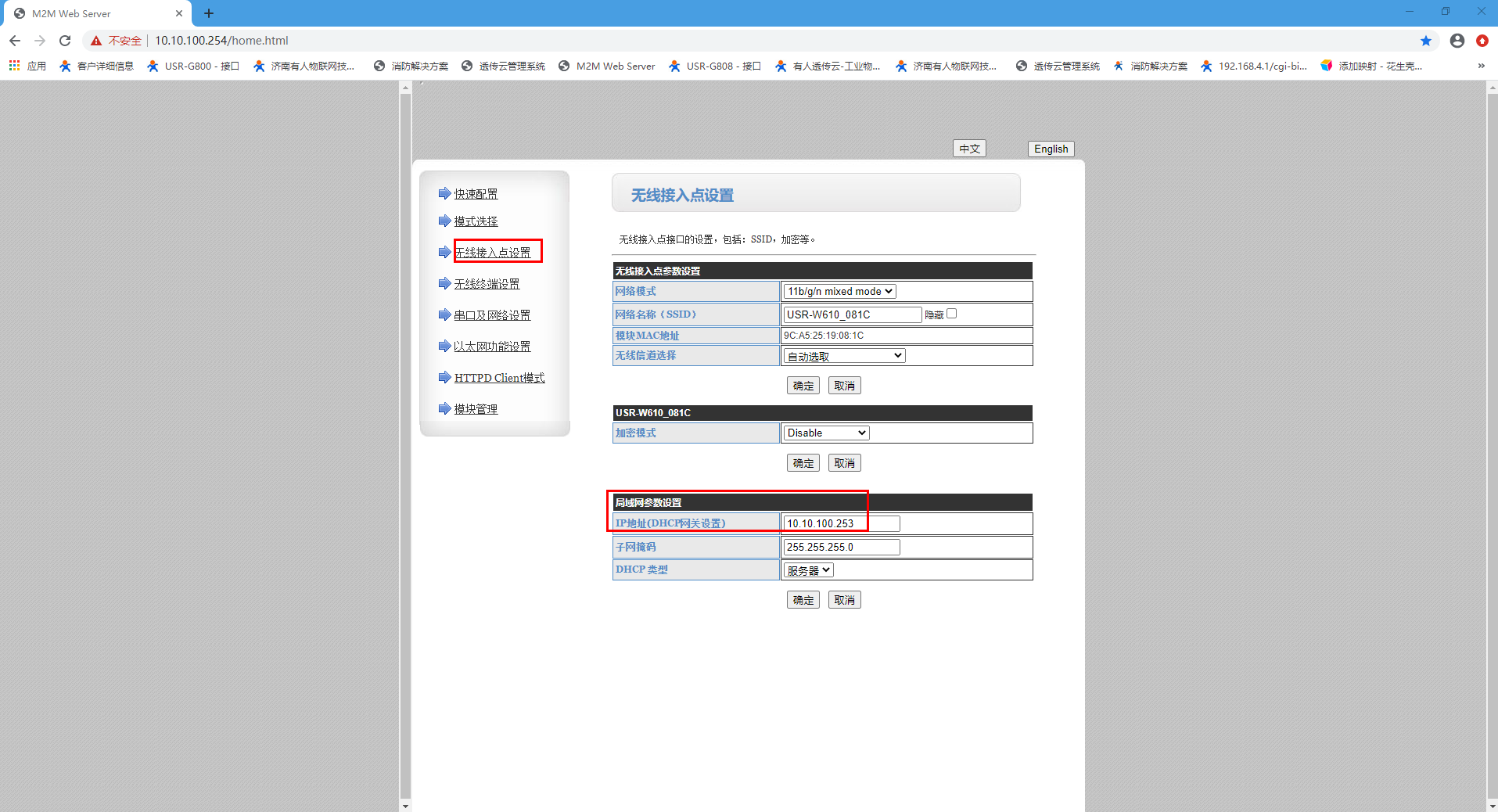 3、設(shè)置AP模式,無線接入點(diǎn)IP設(shè)置10.10.100.254,以太網(wǎng)功能設(shè)置,開啟網(wǎng)口,選擇LAN口,每設(shè)置一項(xiàng)參數(shù),對(duì)應(yīng)點(diǎn)擊下面的確定,最后網(wǎng)頁重啟USR-W610。