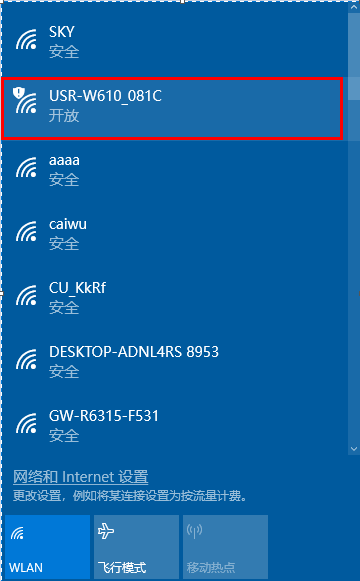 1、禁用其他網(wǎng)卡,保留無線網(wǎng)卡,電腦搜索第二個(gè)USR-W610的WiFi名稱USR-W610_081C,并連接。