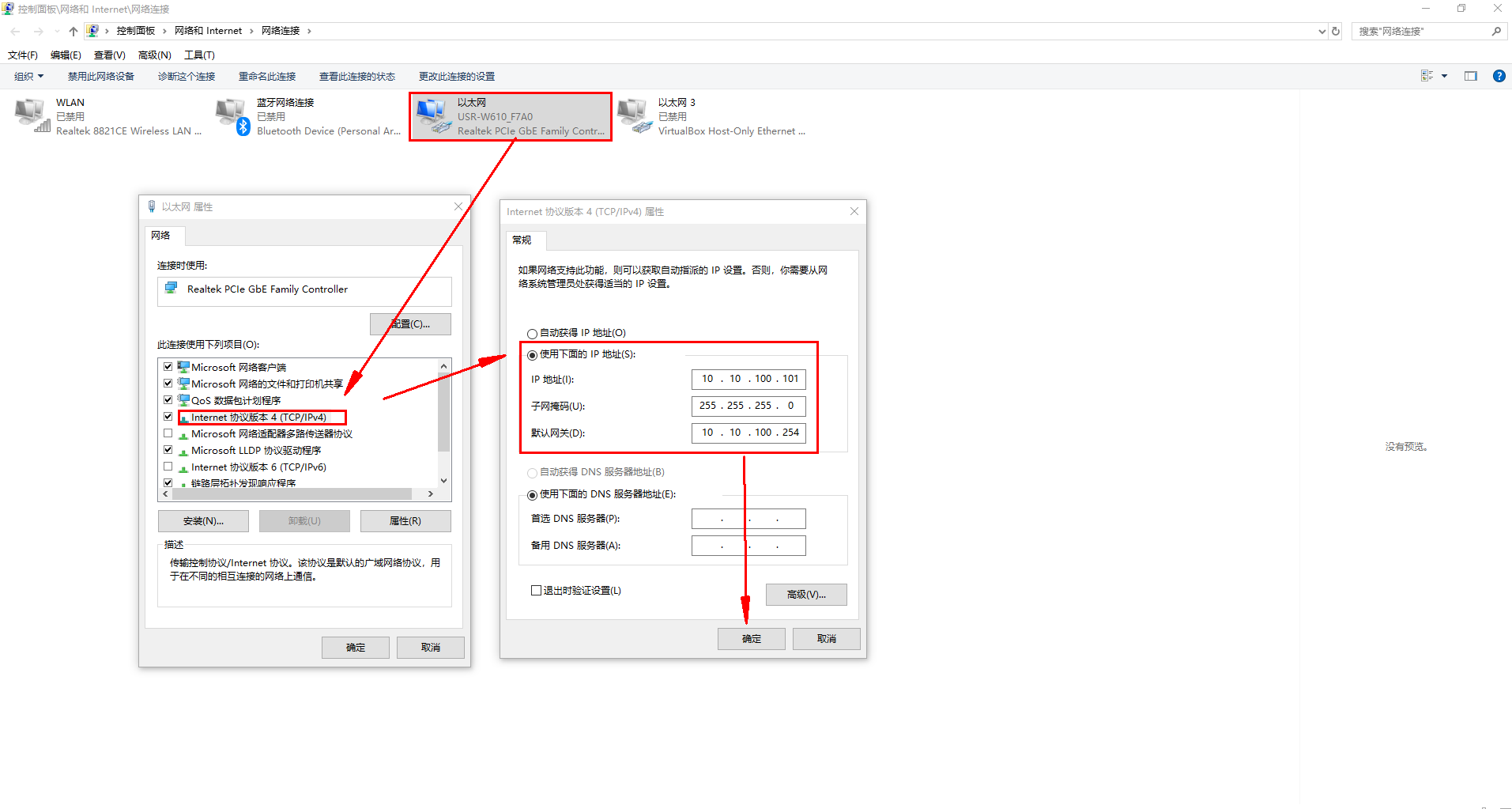 4、打開第1臺(tái)電腦的控制面板,將以太網(wǎng)卡設(shè)置靜態(tài)IP,IPv4設(shè)置10.10.100.101,子網(wǎng)掩碼255.255.255.0,默認(rèn)網(wǎng)關(guān)10.10.100.254,點(diǎn)擊確定。