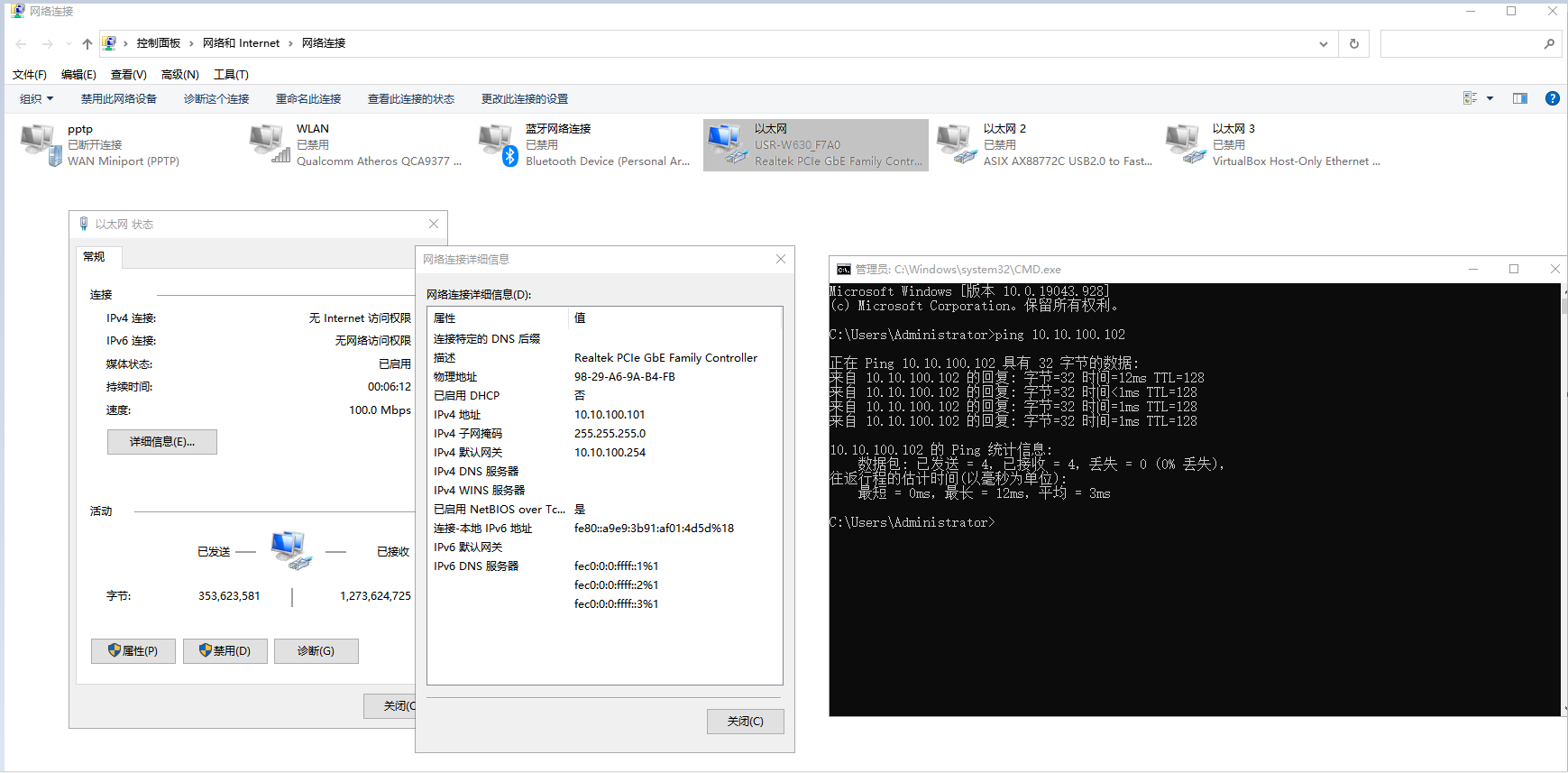 4、打開第2臺電腦的控制面板,將以太網(wǎng)卡設(shè)置靜態(tài)IP,IPv4設(shè)置10.10.100.102,子網(wǎng)掩碼255.255.255.0,默認網(wǎng)關(guān)10.10.100.253,點擊確定。