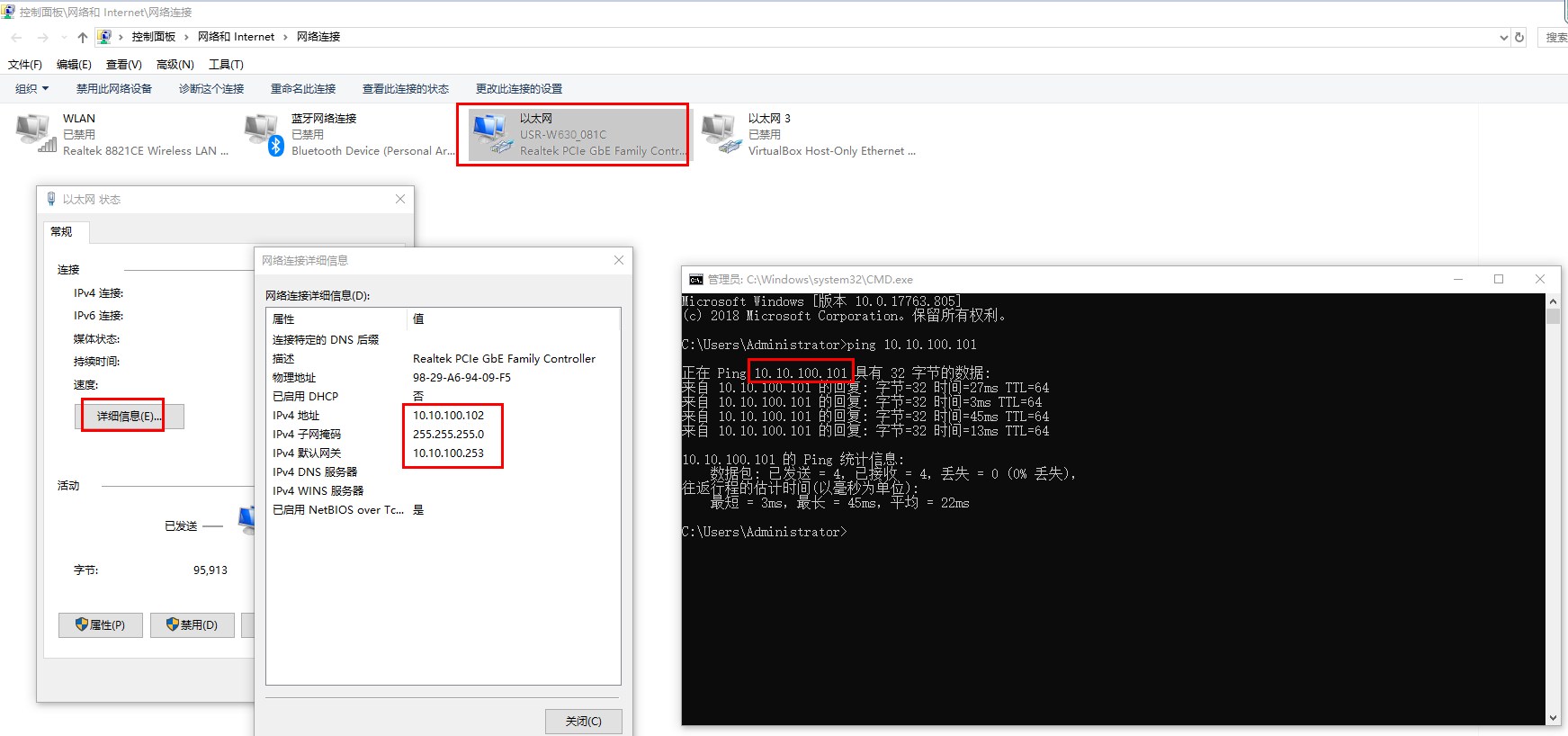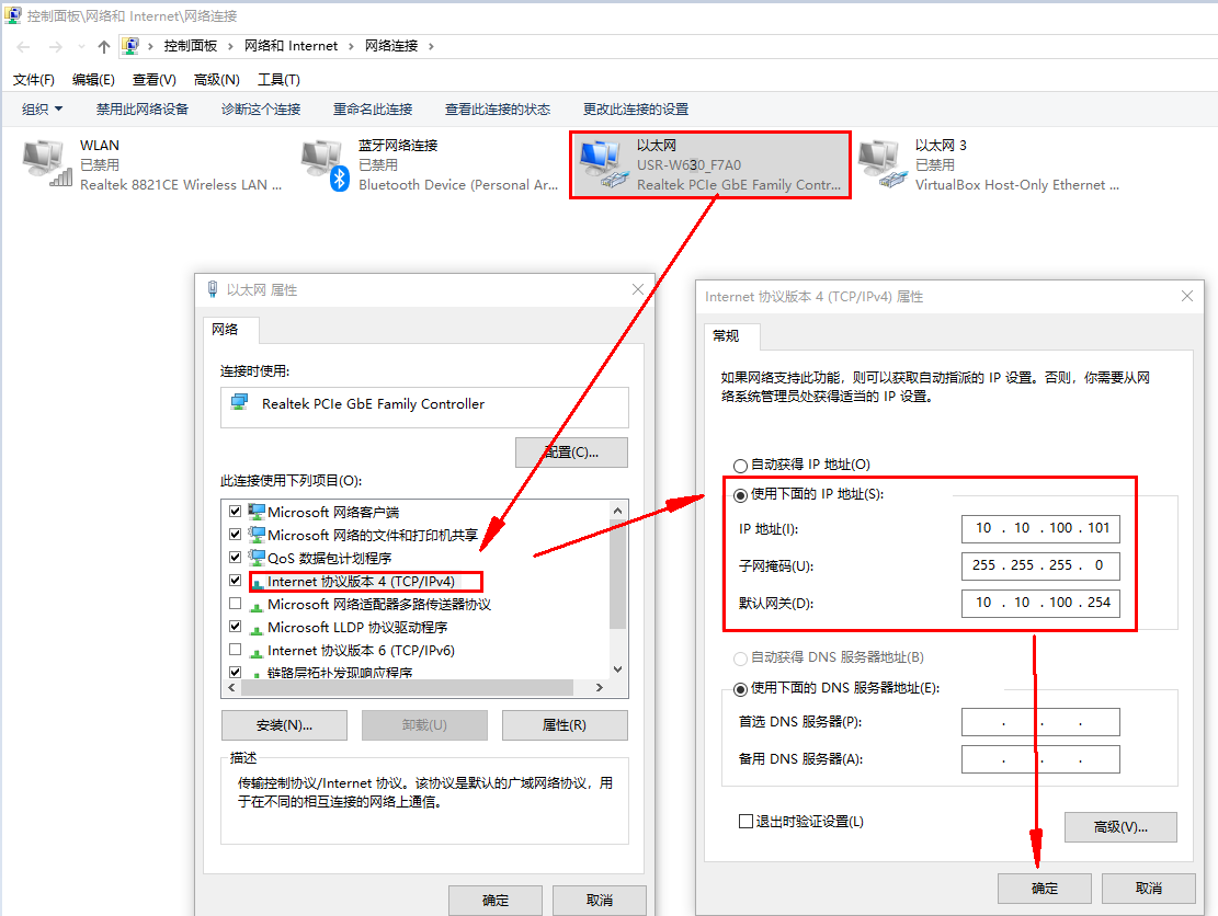 4、打開第1臺電腦的控制面板,將以太網(wǎng)卡設(shè)置靜態(tài)IP,IPv4設(shè)置10.10.100.101,子網(wǎng)掩碼255.255.255.0,默認網(wǎng)關(guān)10.10.100.254,點擊確定。