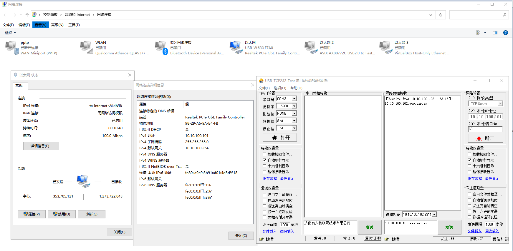 2、第一個電腦打開網(wǎng)絡(luò)調(diào)試助手做TCP server,第二臺電腦打開網(wǎng)絡(luò)調(diào)試助手做TCP client,可以建立TCP連接,可以相互發(fā)送數(shù)據(jù)。