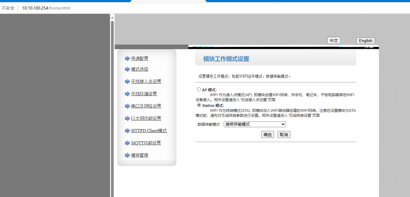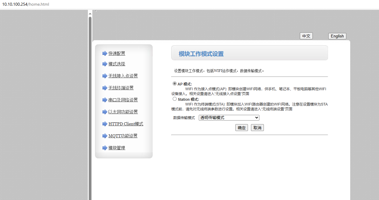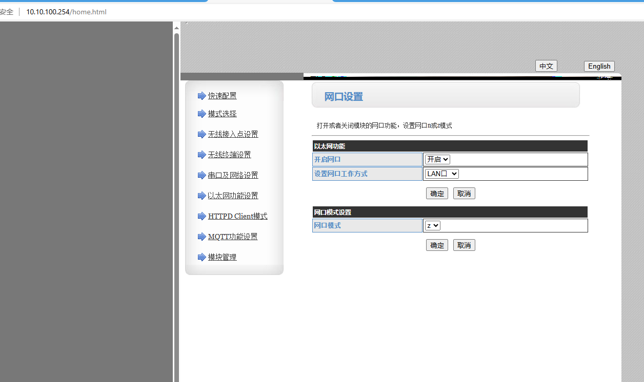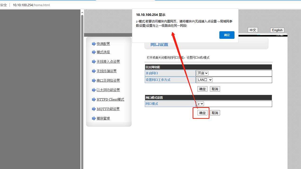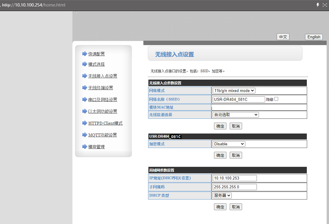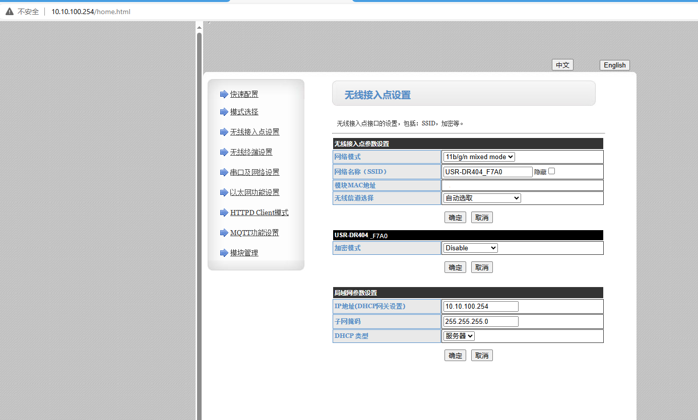 3、設(shè)置AP模式,無(wú)線(xiàn)接入點(diǎn)IP設(shè)置10.10.100.254,以太網(wǎng)功能設(shè)置,開(kāi)啟網(wǎng)口,選擇LAN口,每設(shè)置一項(xiàng)參數(shù),對(duì)應(yīng)點(diǎn)擊下面的確定,最后網(wǎng)頁(yè)重啟USR-DR404。