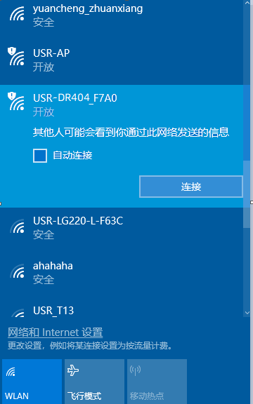 1、禁用其他網(wǎng)卡,保留無(wú)線(xiàn)網(wǎng)卡,電腦搜索第一個(gè)USR-DR404的WiFi名稱(chēng)USR-DR404_F7A0,并連接。