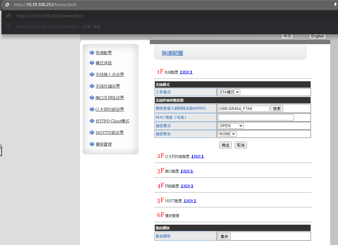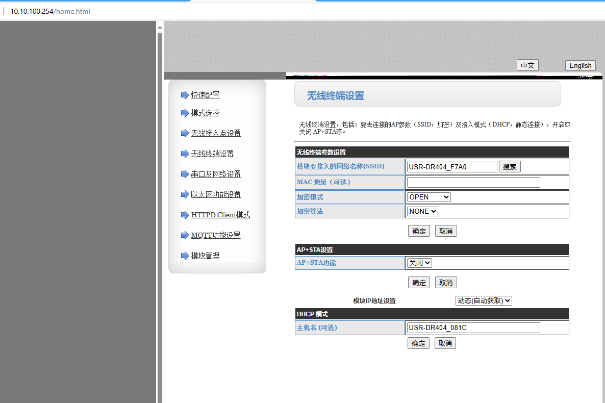 3、設(shè)置STA模式,無(wú)線(xiàn)終端,輸入模塊要連接的網(wǎng)絡(luò)名稱(chēng)USR-DR404_F7A0。以太網(wǎng)功能設(shè)置,開(kāi)啟網(wǎng)口,選擇LAN口,網(wǎng)口模式選擇Z橋接模式。無(wú)線(xiàn)接入點(diǎn)IP設(shè)置10.10.100.253。每設(shè)置一項(xiàng)參數(shù),對(duì)應(yīng)點(diǎn)擊下面的確定,最后網(wǎng)頁(yè)重啟USR-DR404。