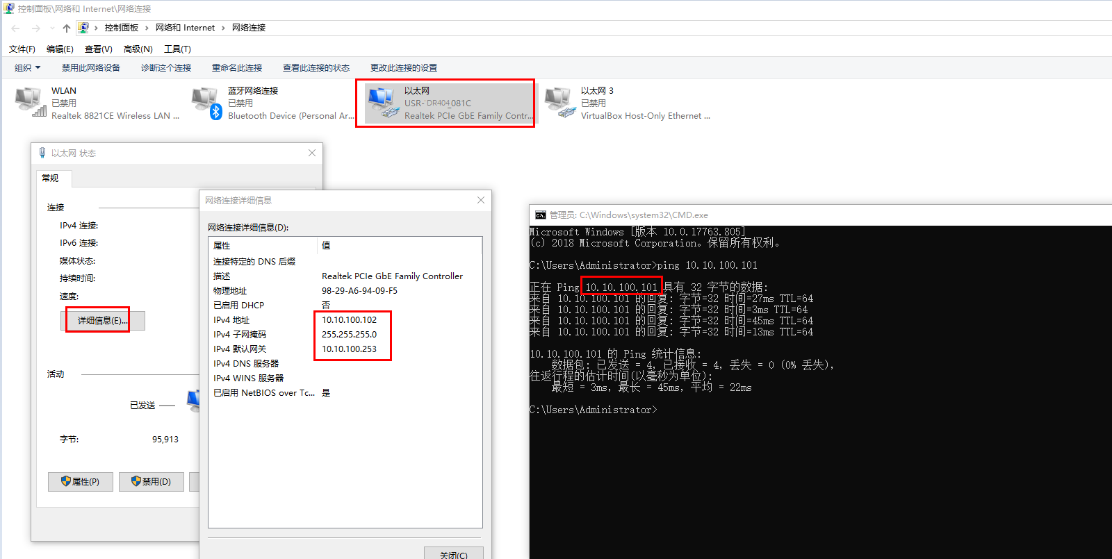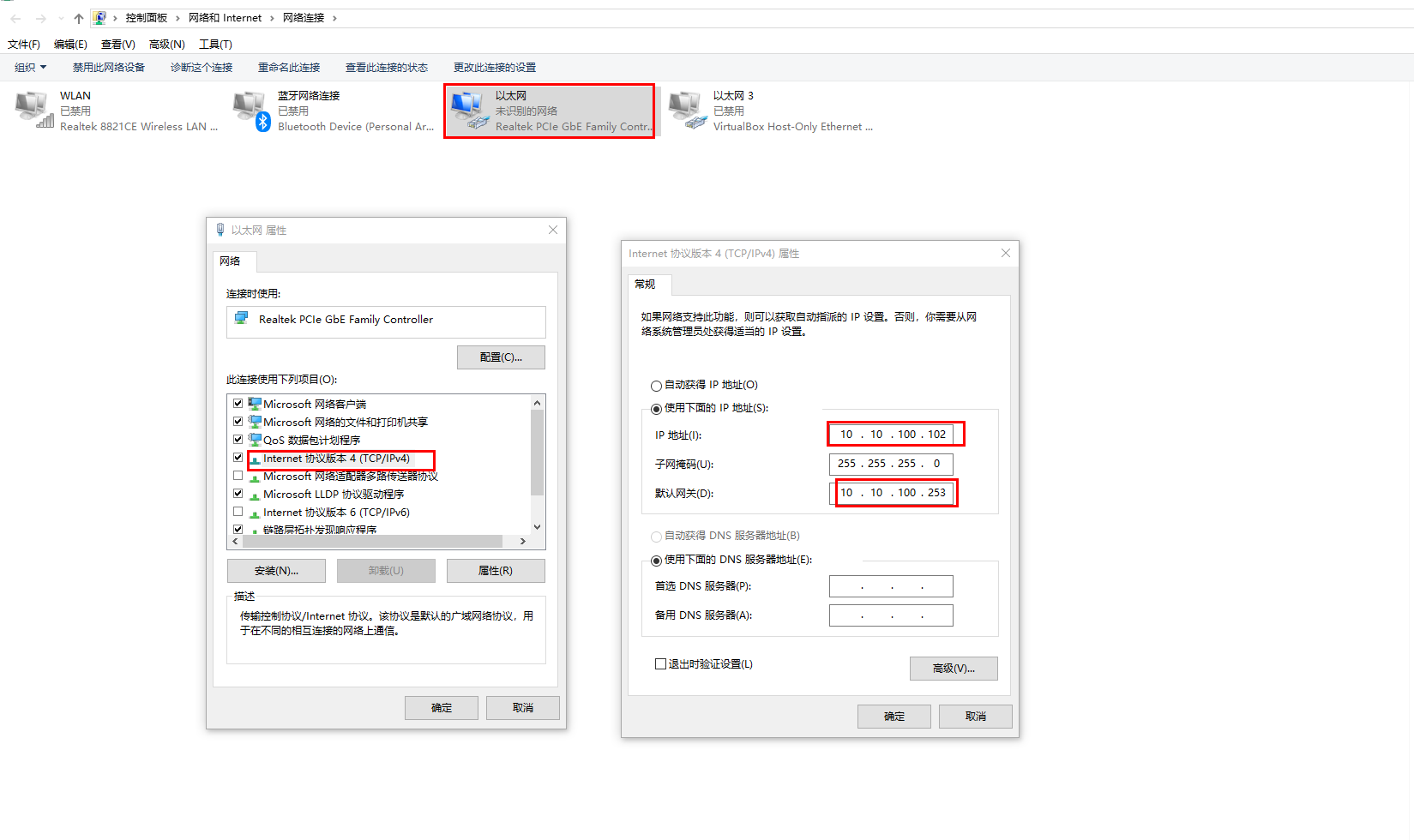 4、打開(kāi)第2臺(tái)電腦的控制面板,將以太網(wǎng)卡設(shè)置靜態(tài)IP,IPv4設(shè)置10.10.100.102,子網(wǎng)掩碼255.255.255.0,默認(rèn)網(wǎng)關(guān)10.10.100.253,點(diǎn)擊確定。