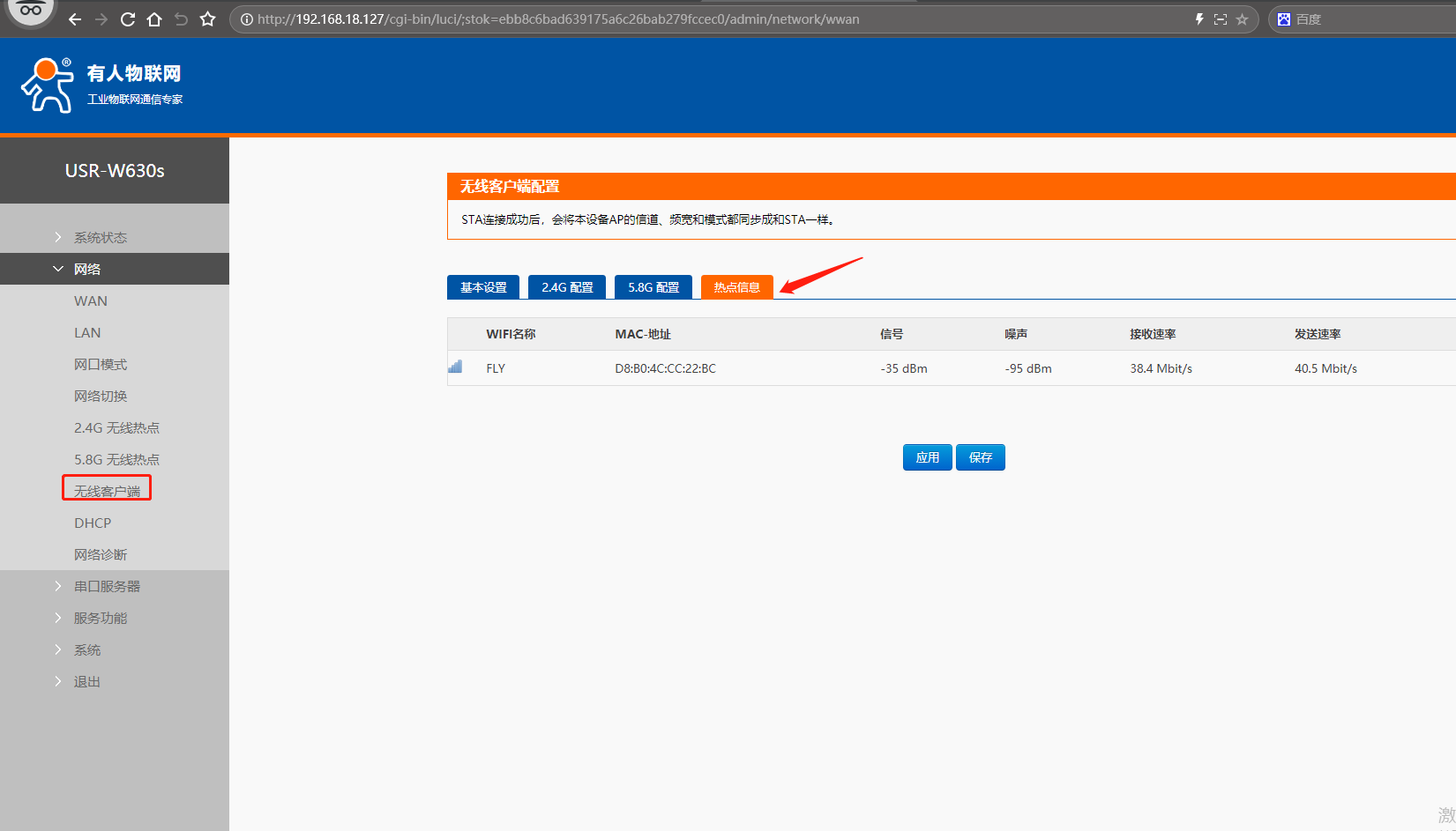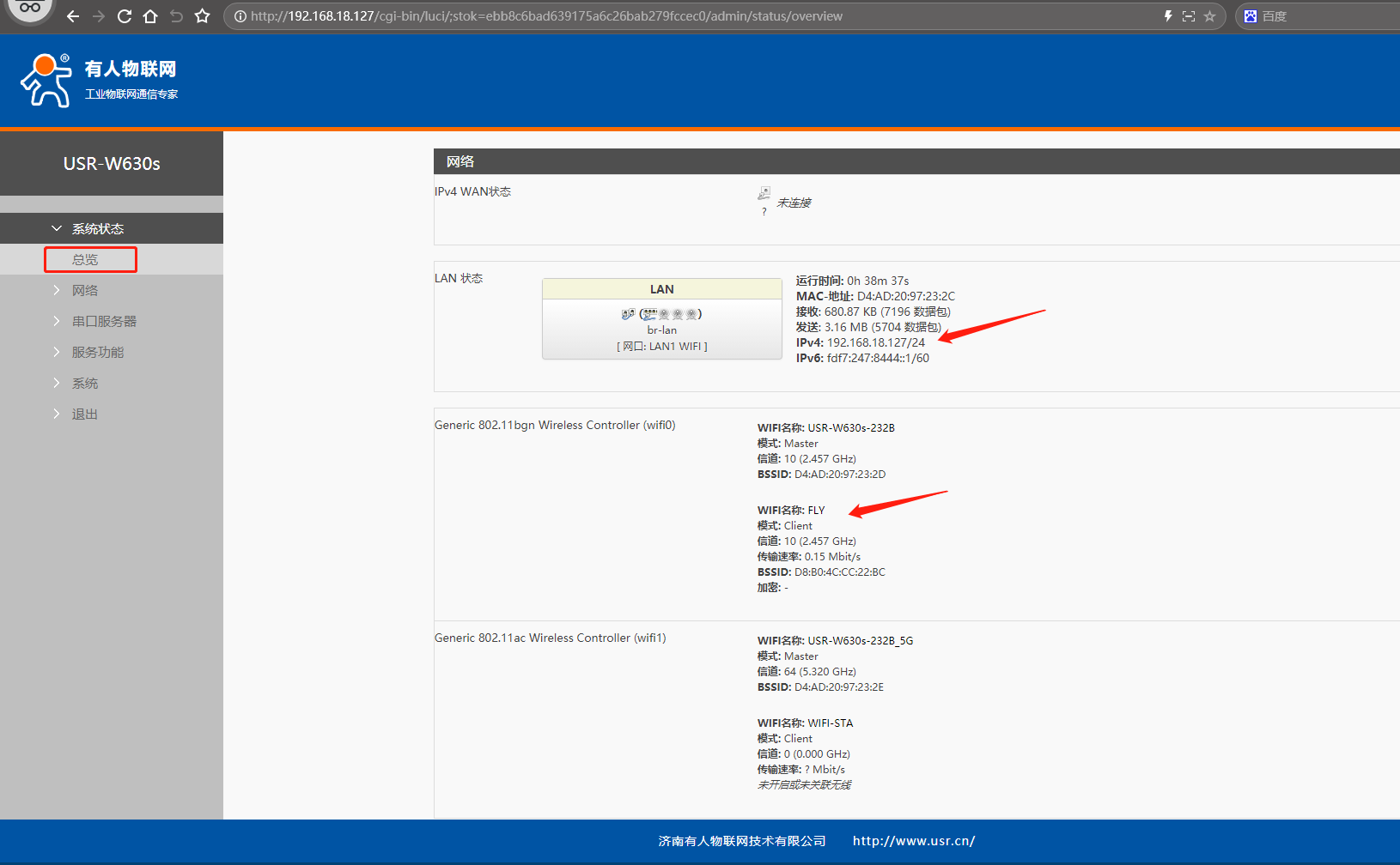 (2)瀏覽器輸入USR-W630s 修改后的LAN口IP,192.168.18.127,可以點擊總覽查看網絡信息,可以點開無線客戶端,熱點信息,查看連接的路由器信息。