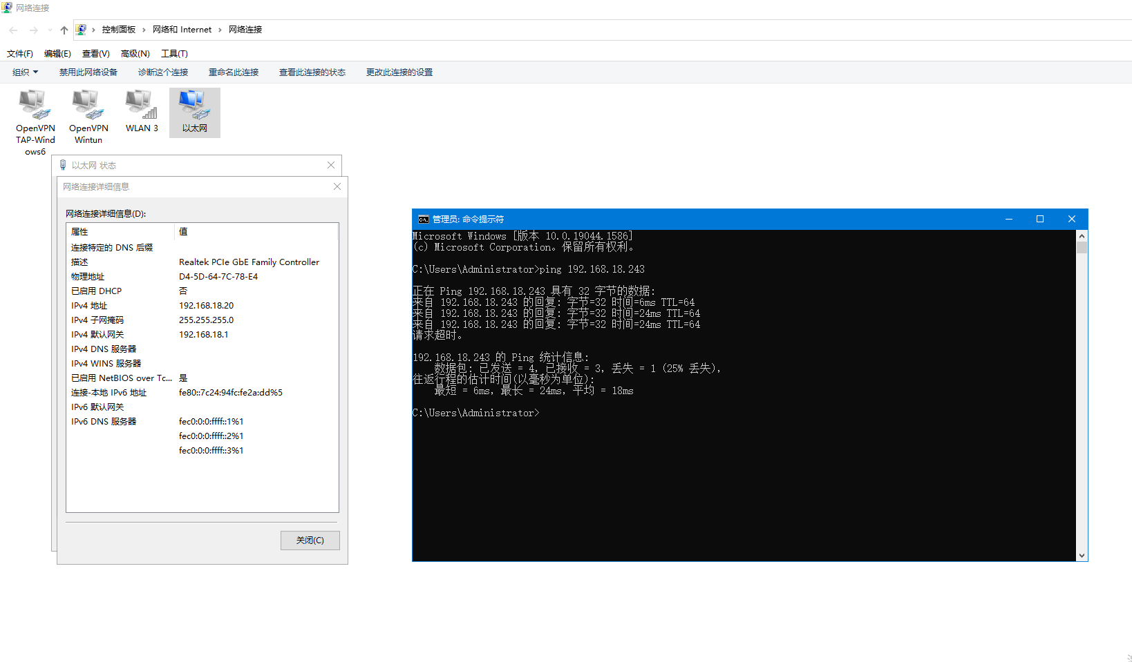(1)第二臺電腦用網線連接路由器的LAN口或者無線連接路由器WiFi,本案例是用無線連接路由器WiFi,電腦無線網卡從路由器獲取的IP是192.168.18.243。