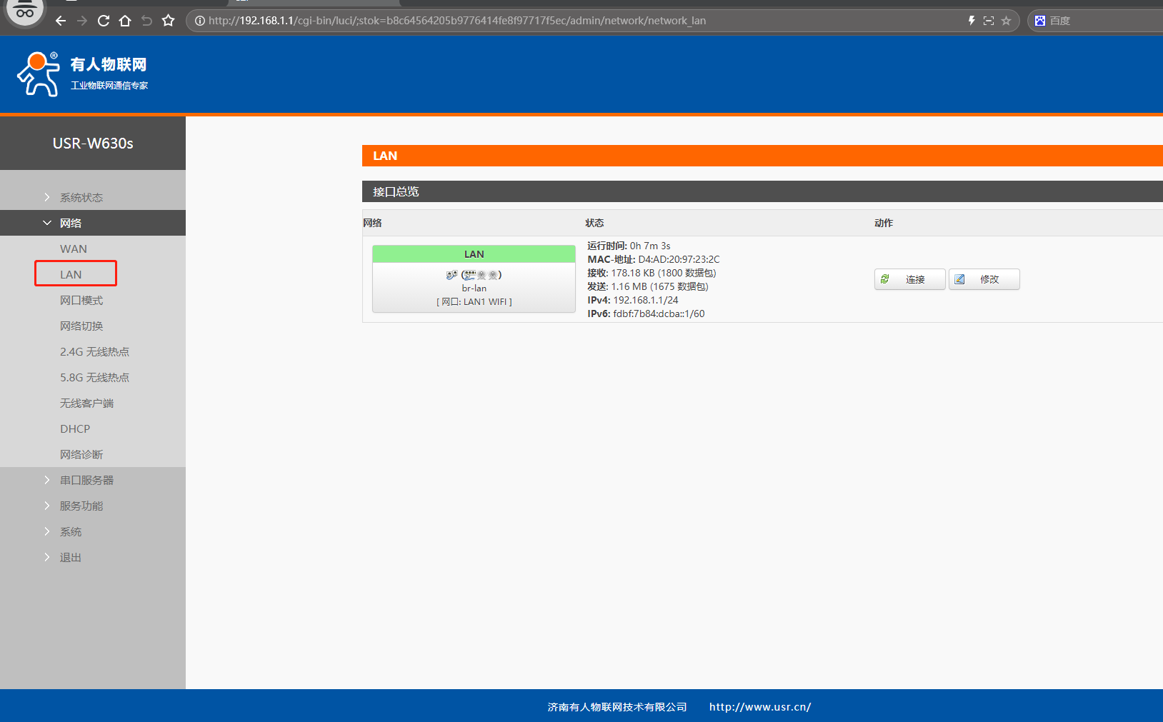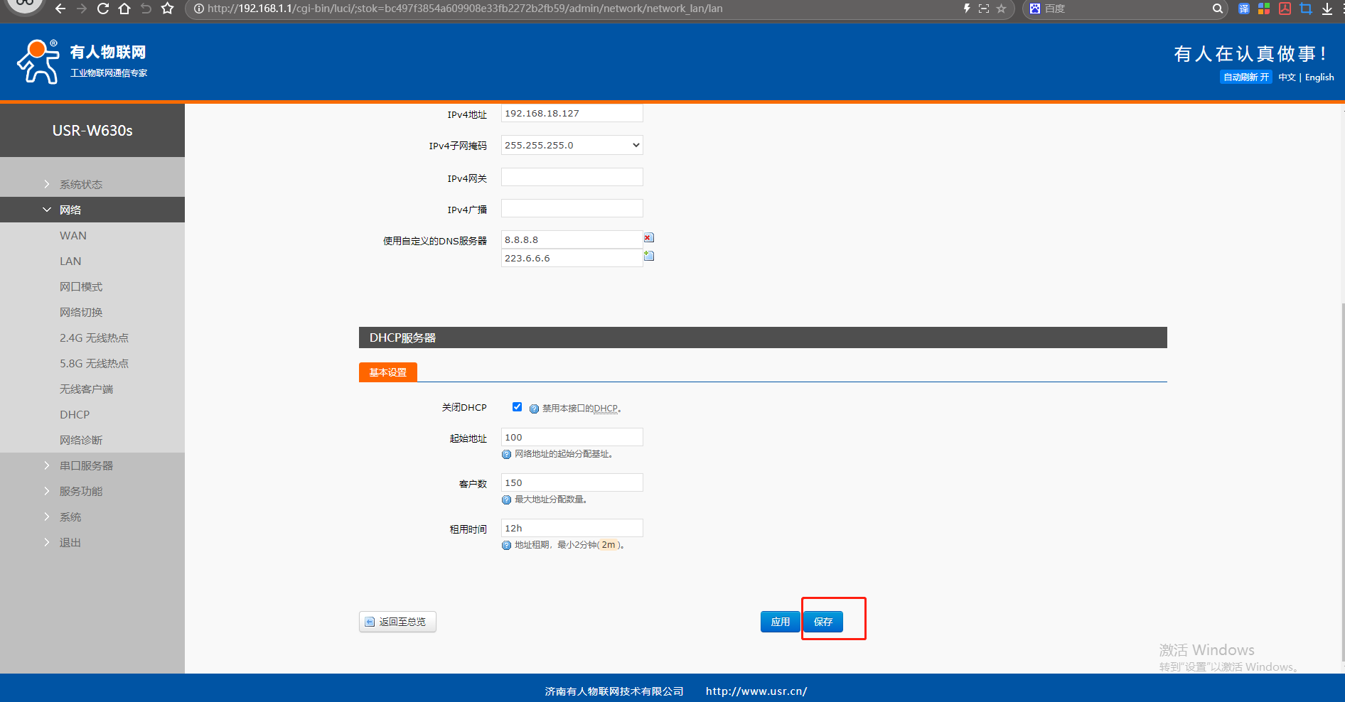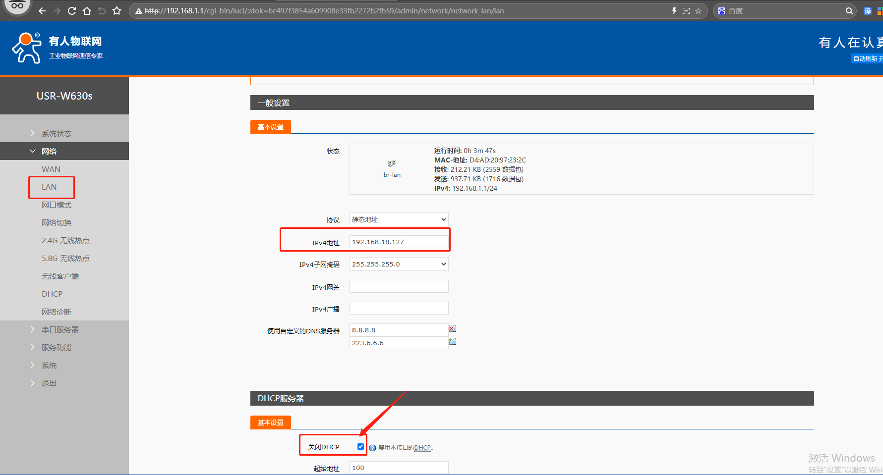 (2)點開網頁網絡,點擊LAN,點擊修改,IPv4地址設置和USR-W630s STA連接的路由器 IP同網段(不重復、不沖突的IP)192.168.18.127。DHCP服務器設置,關閉DHCP功能。點擊保存。