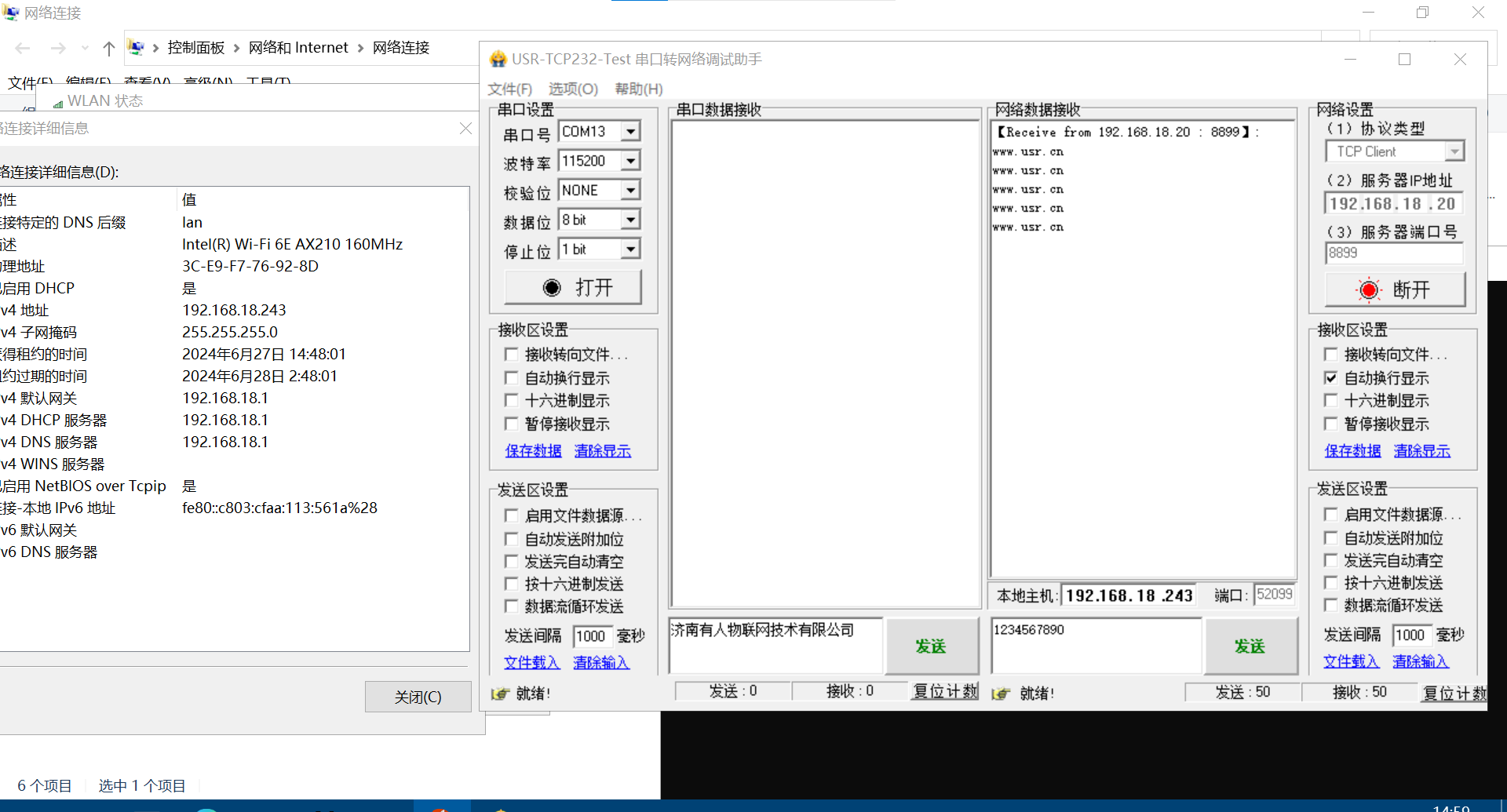 (2)無線連接路由器的第二臺電腦,打開網絡助手,協議類型TCP client,服務器IP地址填192.168.18.20,服務器端口號填8899,點擊連接。