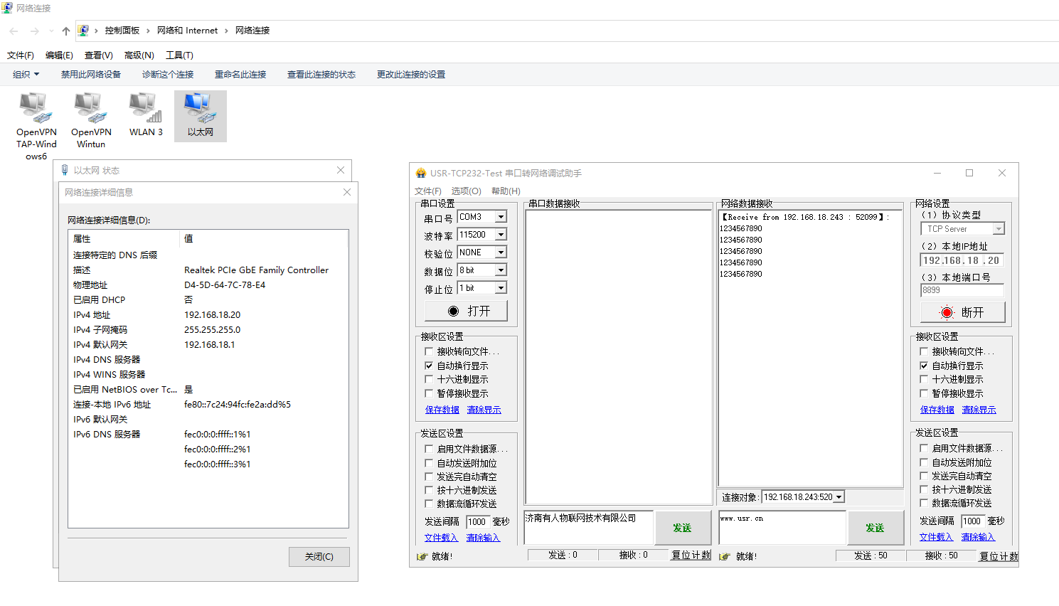 (1)第一臺電腦用網線連接USR-W630s的LAN口,電腦設置和USR-W630s STA連接的路由器同網段IP,案例設置的是192.168.18.20。