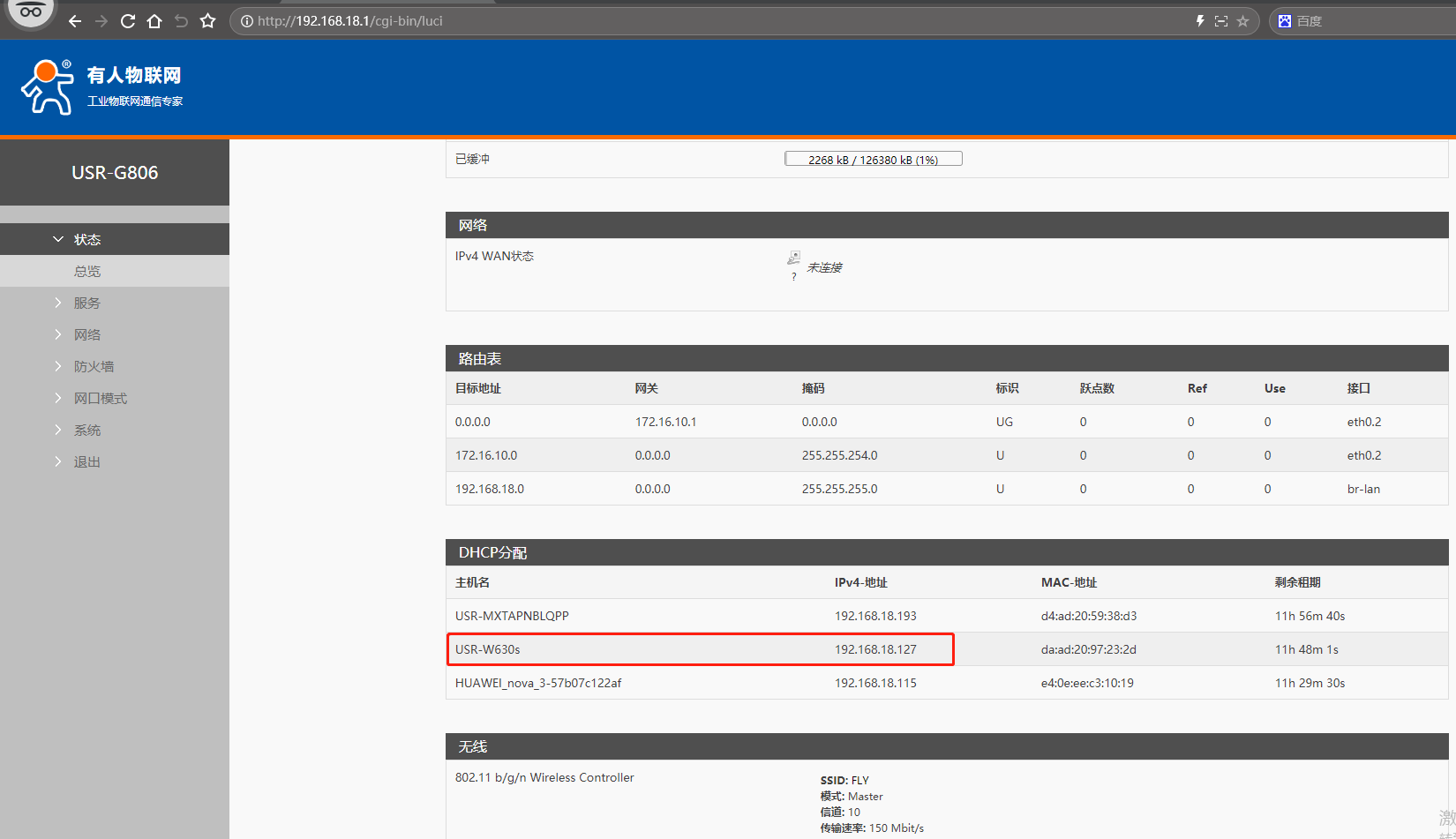 (1)USR-W630s 單獨設置STA模式連接路由器,可以登陸路由器網頁查看路由器分配給USR-W630s的IP,再設置橋接模式的時候,可以將這IP 192.168.18.127固定給USR-W630s。