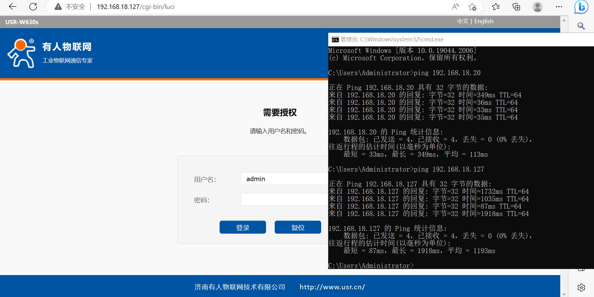 (2)無線連接路由器的第二臺電腦,去PING連接路由器的USR-W630s LAN接第一臺電腦的IP 192.168.18.20。
