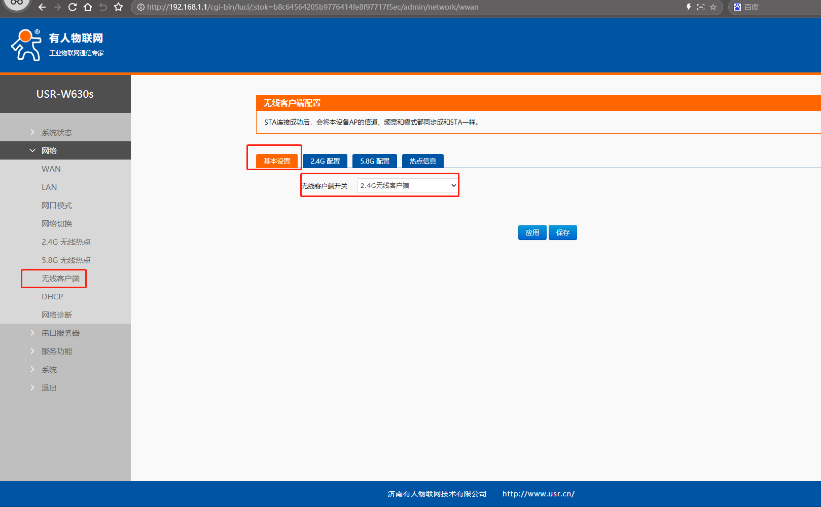 (1)點開網頁網絡,點擊無線客戶端,點擊基本設置,無線客戶端開關,選擇2.4G無線客戶端,點擊保存。