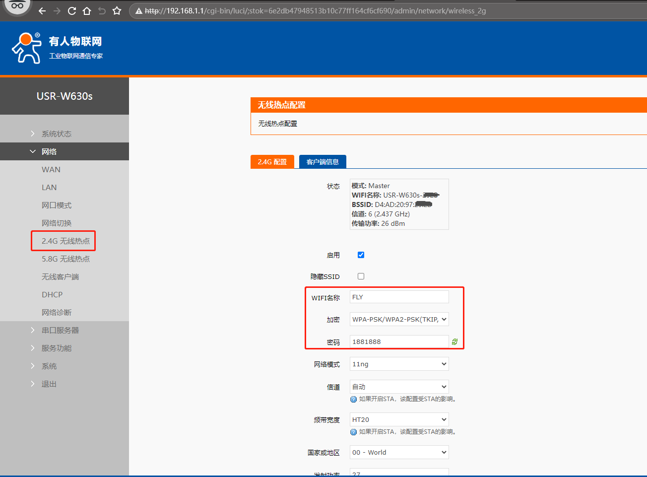 (3)第一個USR-W630s 做AP模式,點開網頁網絡,點擊2.4G無線熱點,2.4G配置,修改WIFI名稱為FLY,設置密碼18881888,點擊保存。
