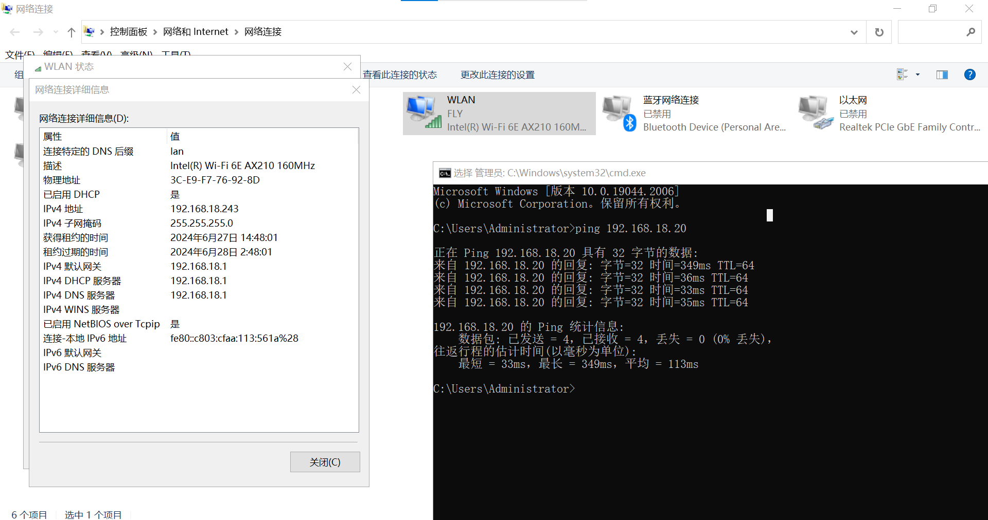 (1)第二臺電腦無線連接第1個USR-W630s WiFi,獲取的IP是192.168.18.243。