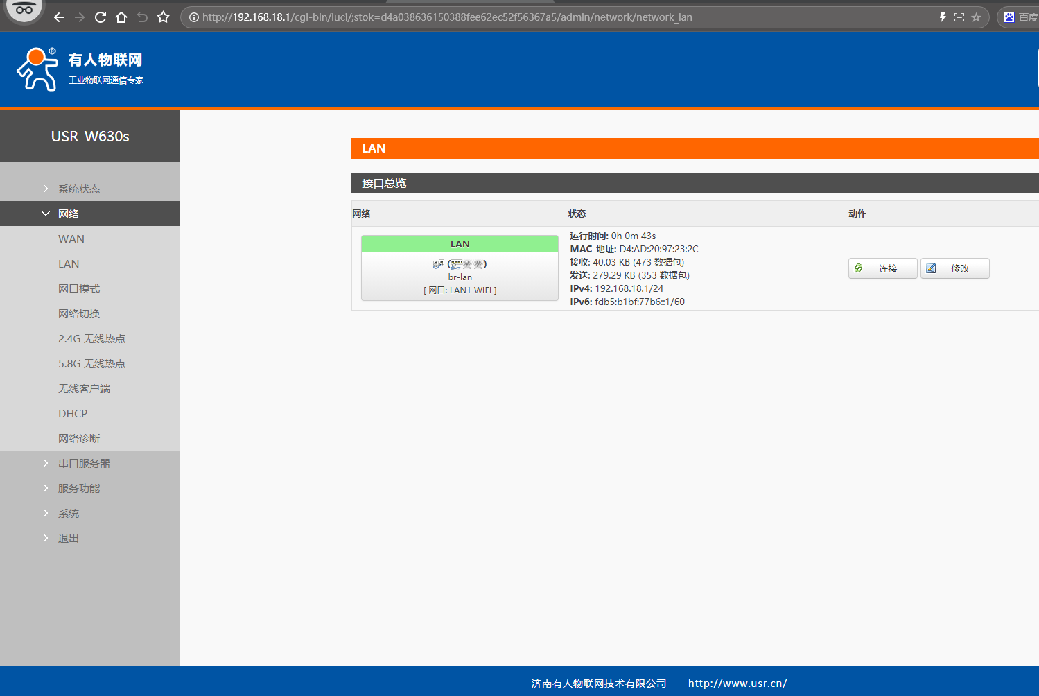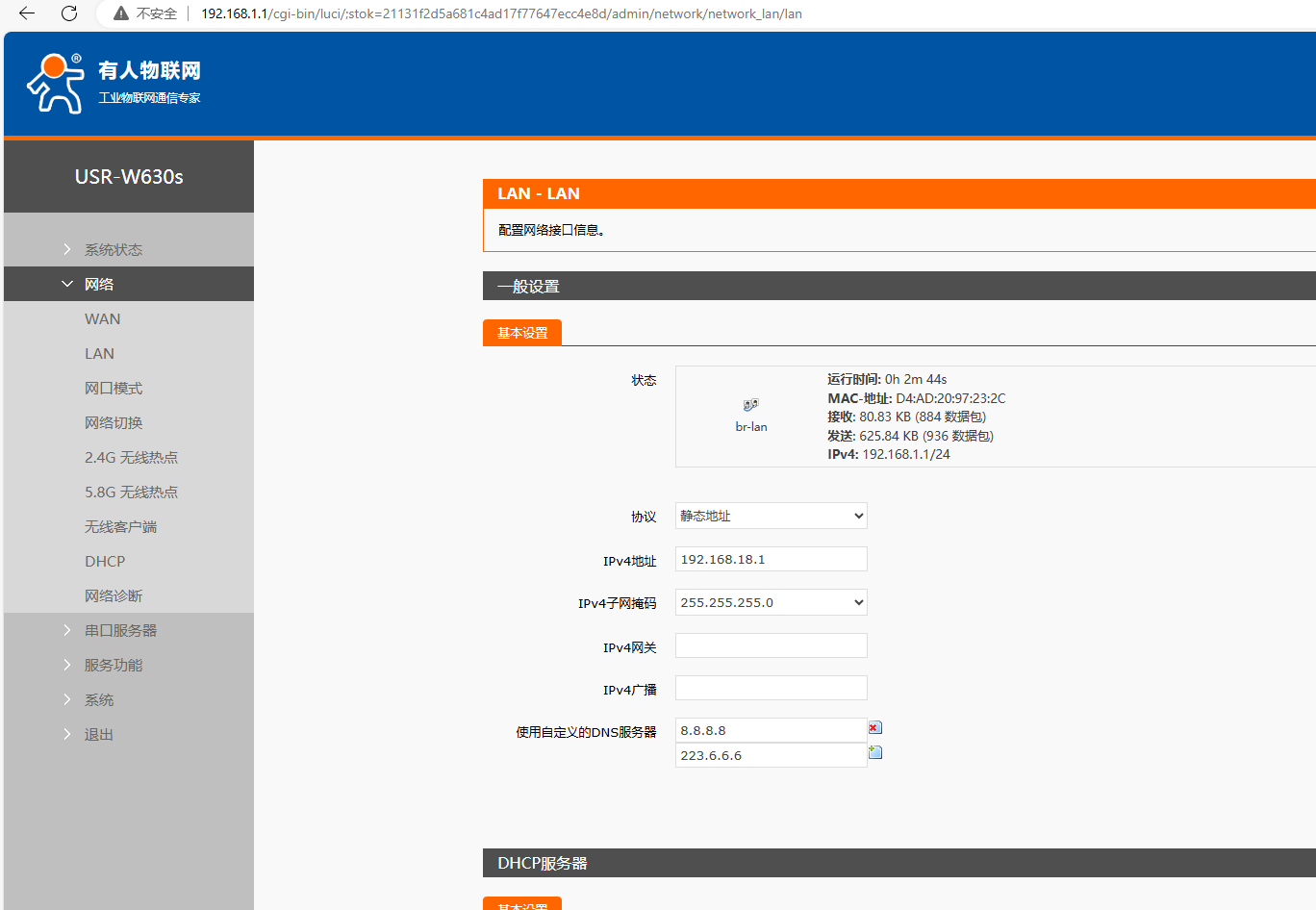 (1)點開網頁網絡,點擊LAN,點擊修改,IPv4地址設置和USR-W630s STA連接的第1個USR-W630s IP同網段(不重復、不沖突的IP)192.168.18.127。DHCP服務器設置,關閉DHCP功能。點擊保存。