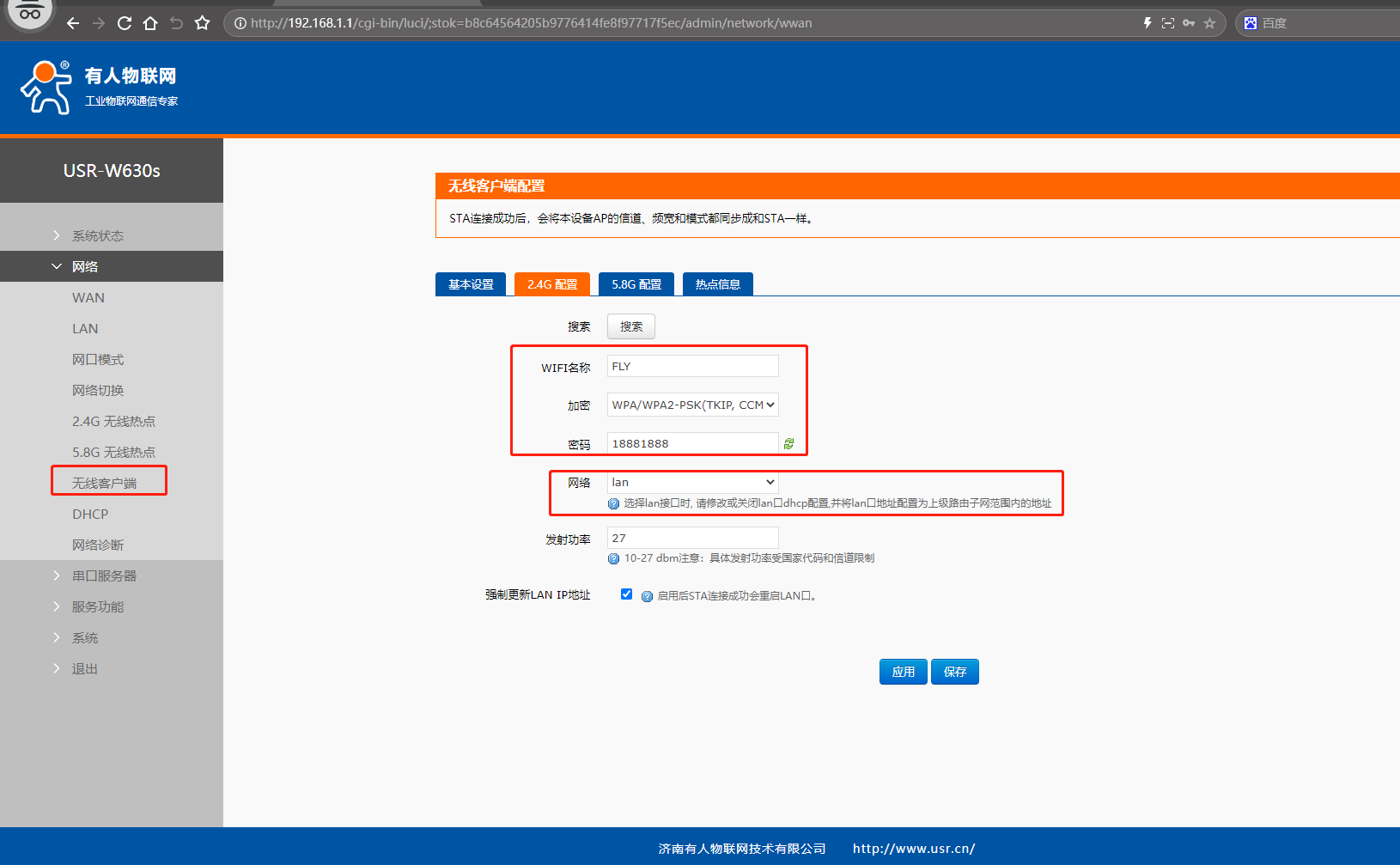 (2)點開網頁2.4G配置,填入STA模式要連接的第1個USR-W630s WiFi名稱FLY,填入第1個USR-W630s密碼,網絡選擇lan。注意選擇lan接口時,請修改或關閉lan口dhcp配置,并將lan口地址配置為第1個USR-W630s子網范圍內的地址。點擊保存。