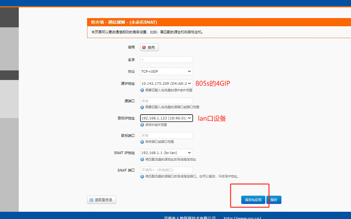 跳轉到如下界面,協議按照需要設置,源IP填G805s的4G(專網) IP,目標IP地址填寫lan口所連設備的IP,點擊保存&應用。