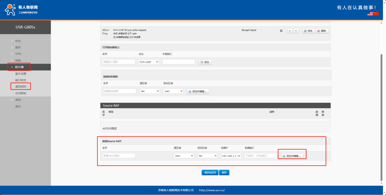 2、在防火墻--通訊規則,新建Source NAT,名稱自定義,原區域選擇wan,目標區域選擇lan,到源IP選擇G805s的lan口IP,點擊添加并編輯。