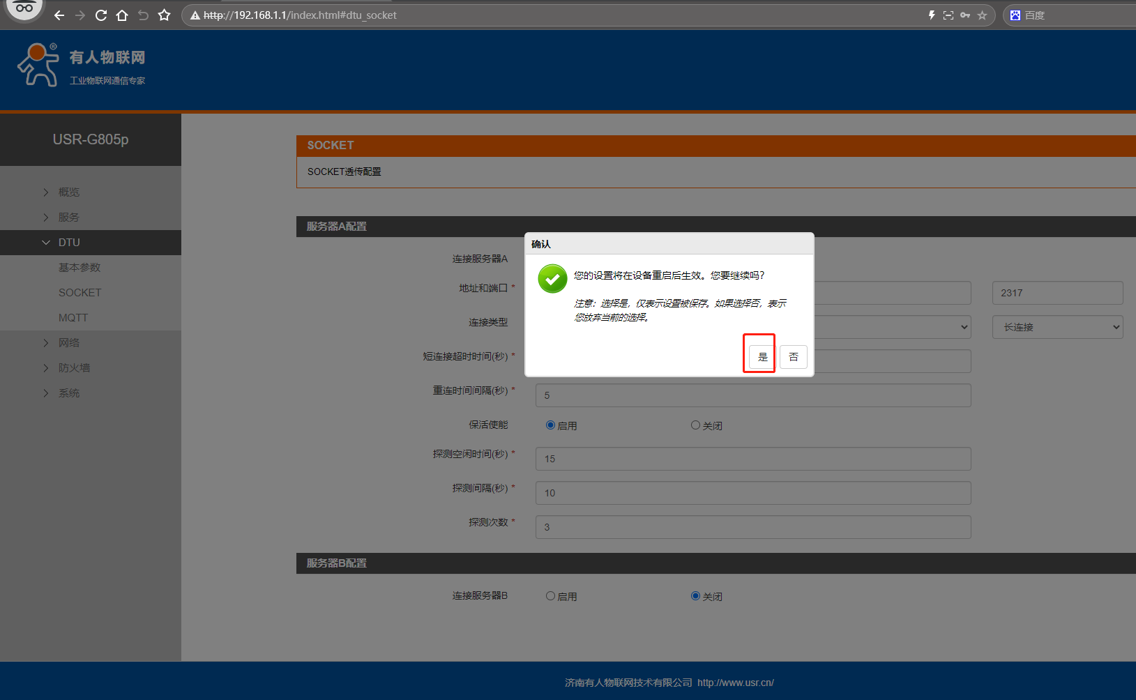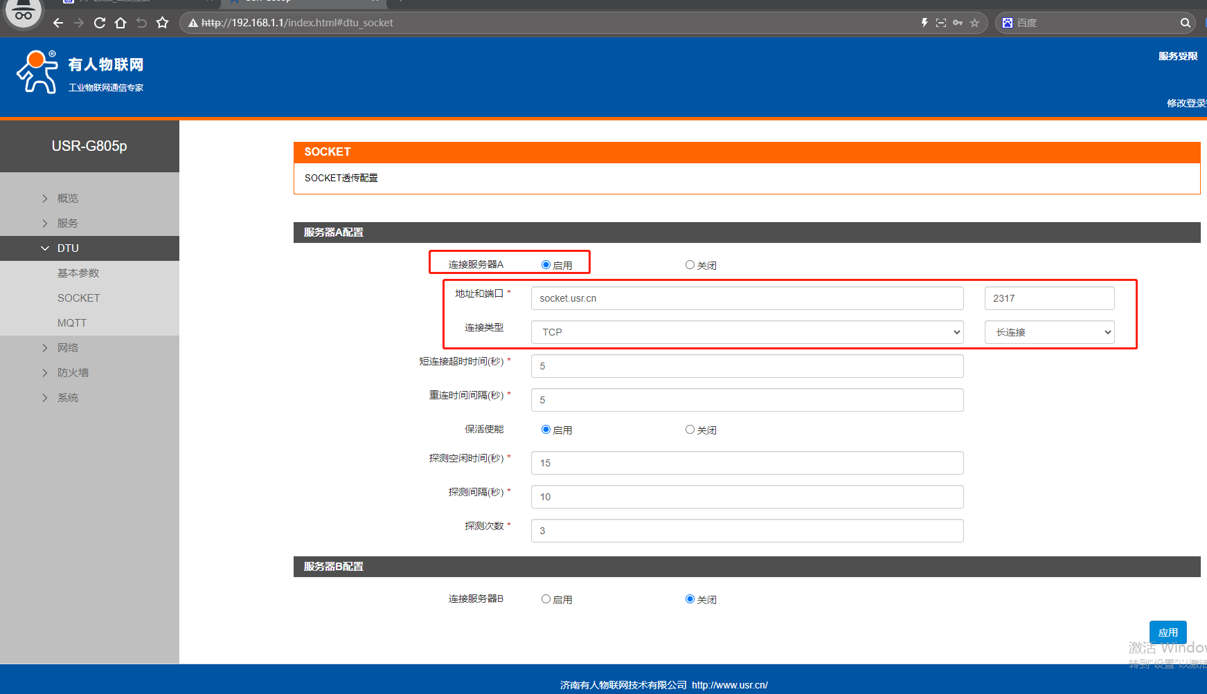 網頁點擊DTU,點擊SOCKET,連接服務器A,點擊啟用,地址填有人公司測試服務器socket.usr.cn,端口號2317,連接類型TCP,長連接。點擊應用。