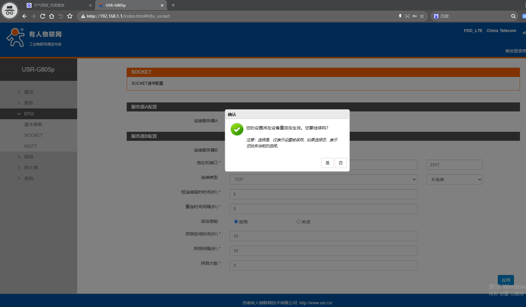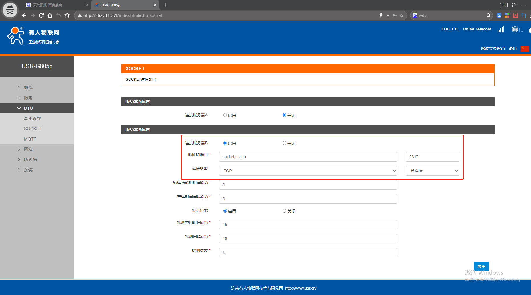 網頁點擊DTU,點擊SOCKET,連接服務器B,點擊啟用,地址填有人公司測試服務器socket.usr.cn,端口號2317,連接類型TCP,長連接。點擊應用。