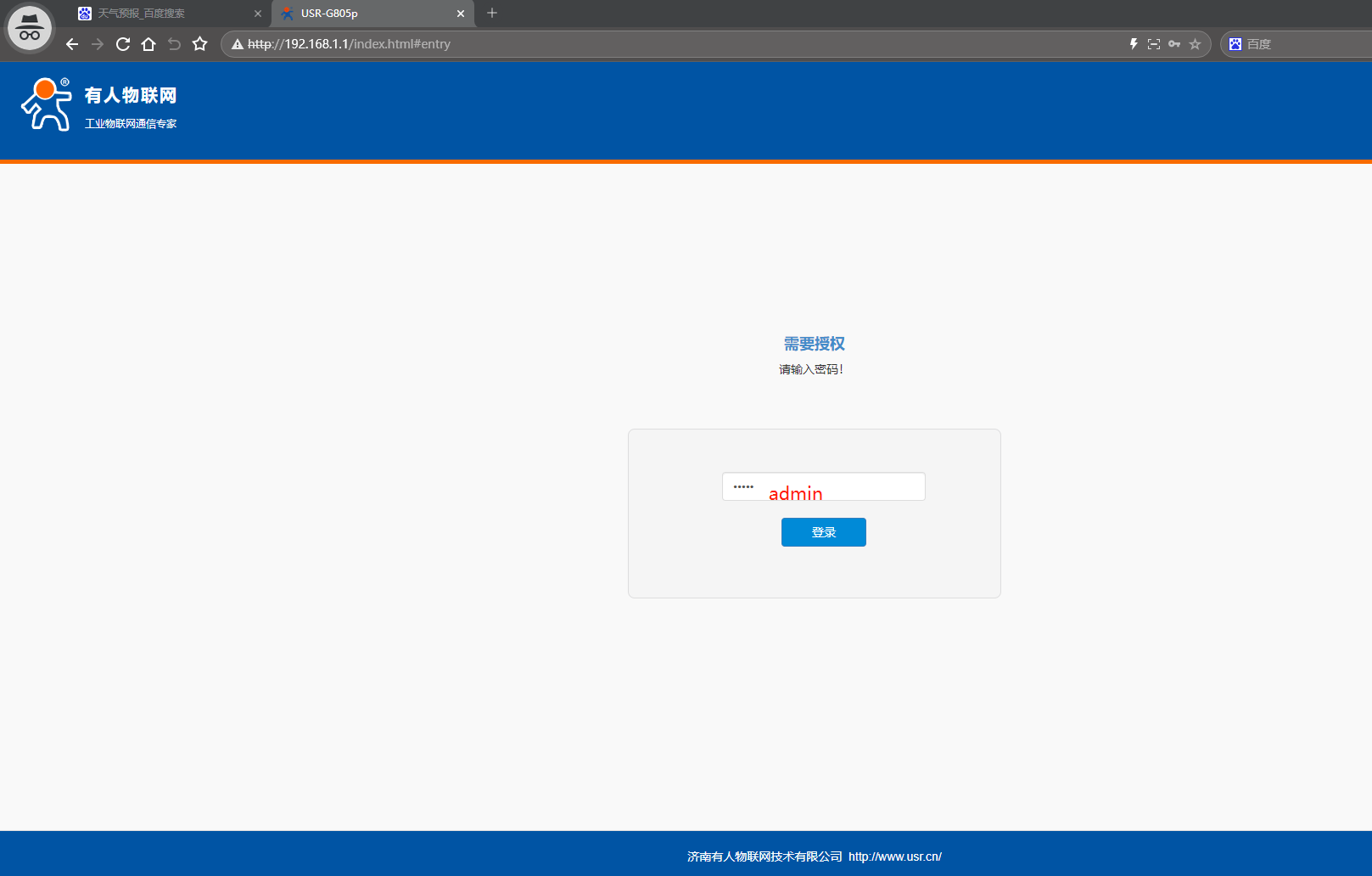 1、瀏覽器輸入192.168.1.1登陸USR-G806p網頁,密碼是admin。