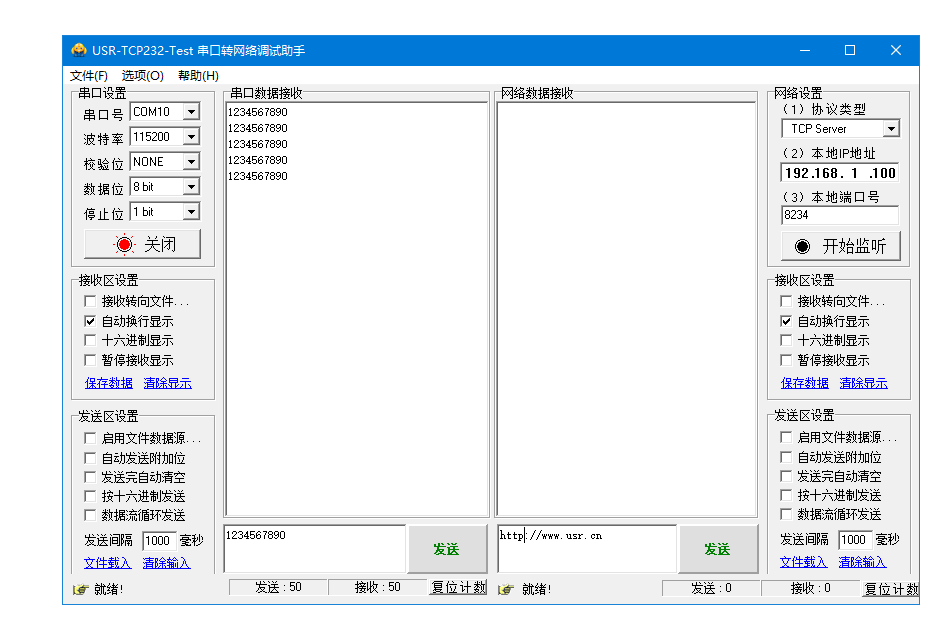 1、打開串口助手,選擇USB-RS485串口線的COM口號,串口參數和USR-G805p一致。測試串口向有人測試服務器發送數據,有人測試服務器向串口返回同樣數據。證明產品聯網正常,串口通訊正常。