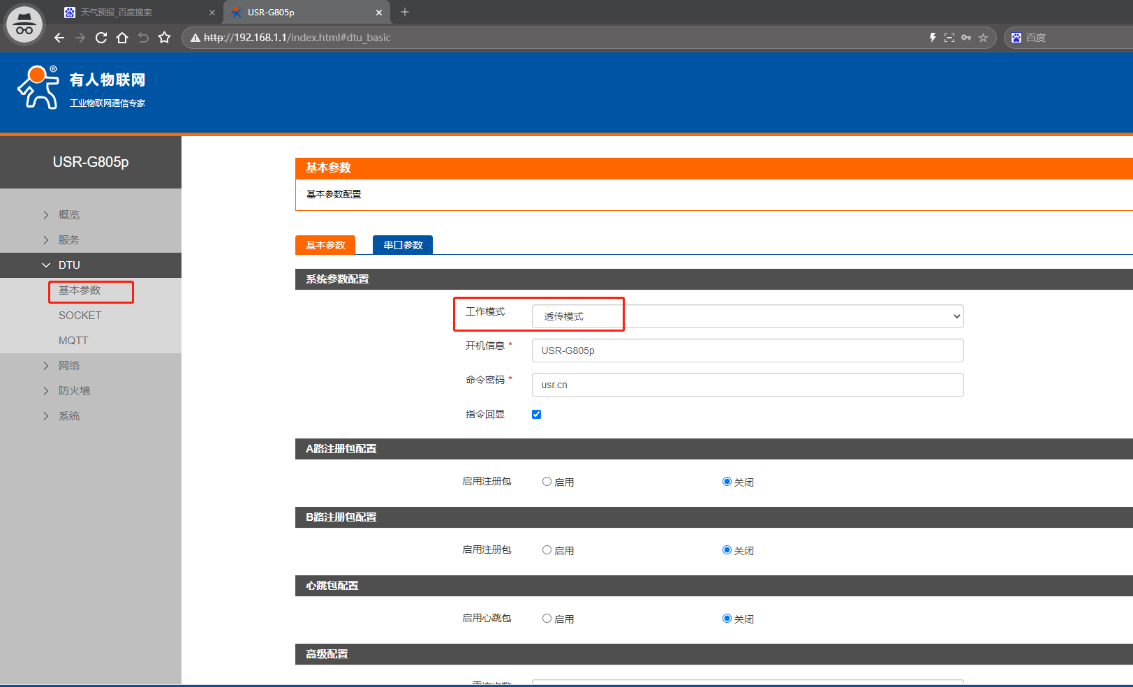 網頁點擊DTU,點擊基本參數,工作模式選擇透傳模式。點擊應用。
