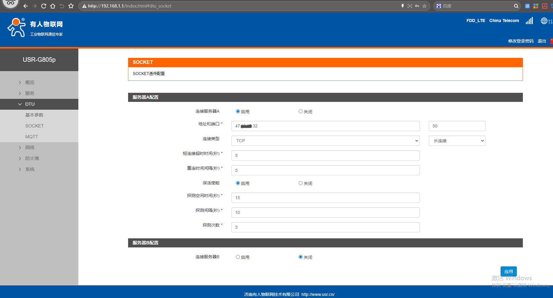 網頁點擊DTU,點擊SOCKET,連接服務器A,點擊啟用,地址填遠程服務器,端口號50,連接類型TCP,長連接。點擊應用。