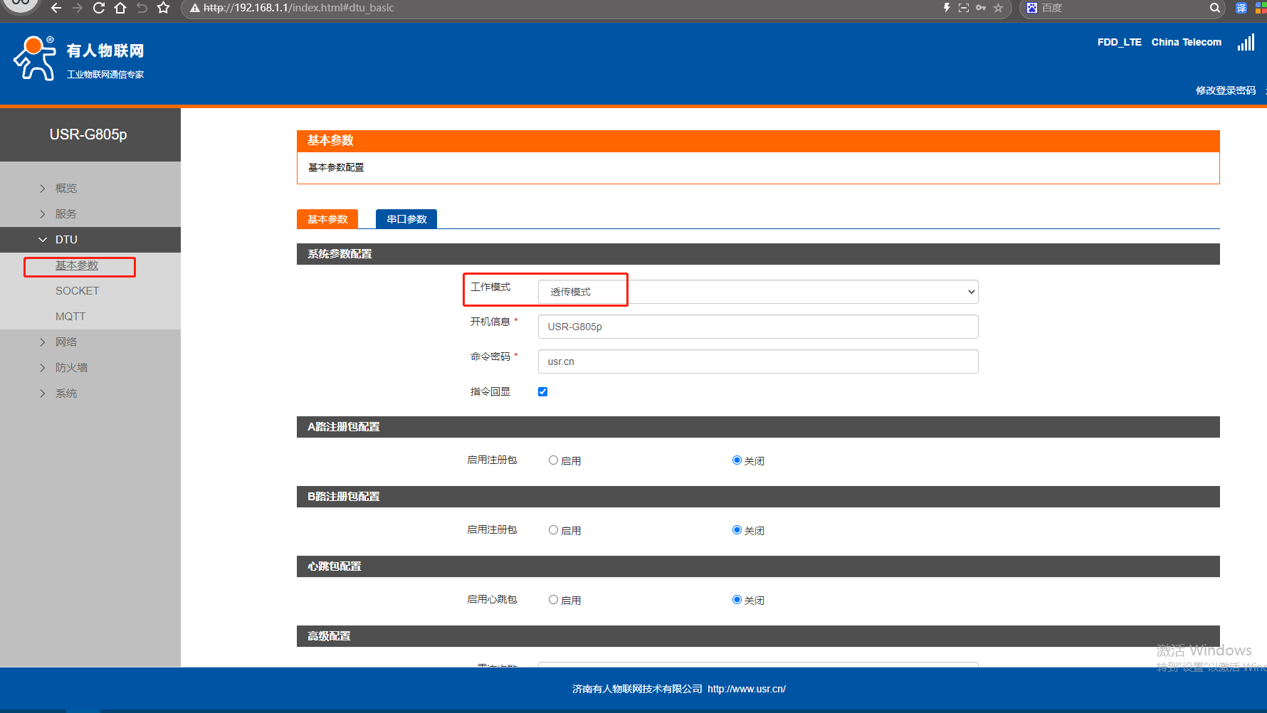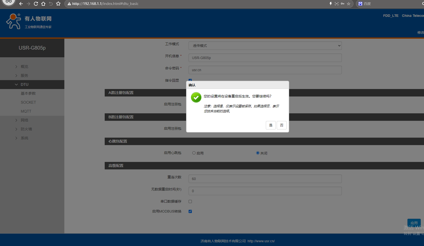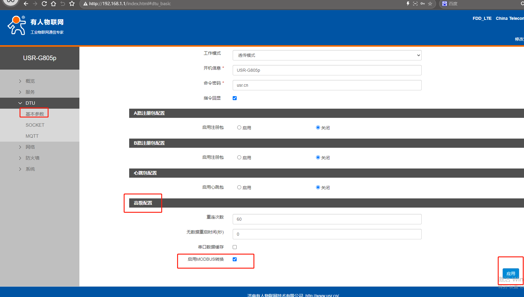網頁點擊DTU,點擊基本參數,工作模式選擇透傳模式,最下面高級配置,啟用MODBUS轉換勾選。最后點擊應用。
