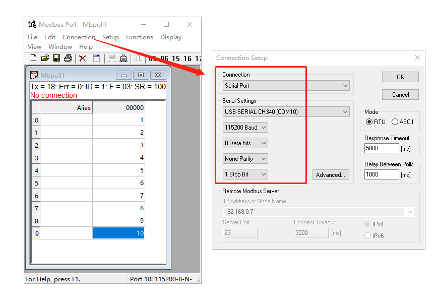 4、Modbus Poll軟件,點擊Connection,選擇Serial Port,選擇對應的COM口COM10,對應USR-G805p的串口參數,最后點擊OK。