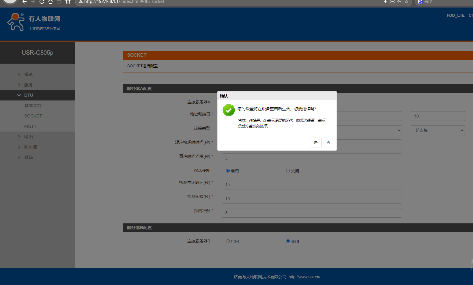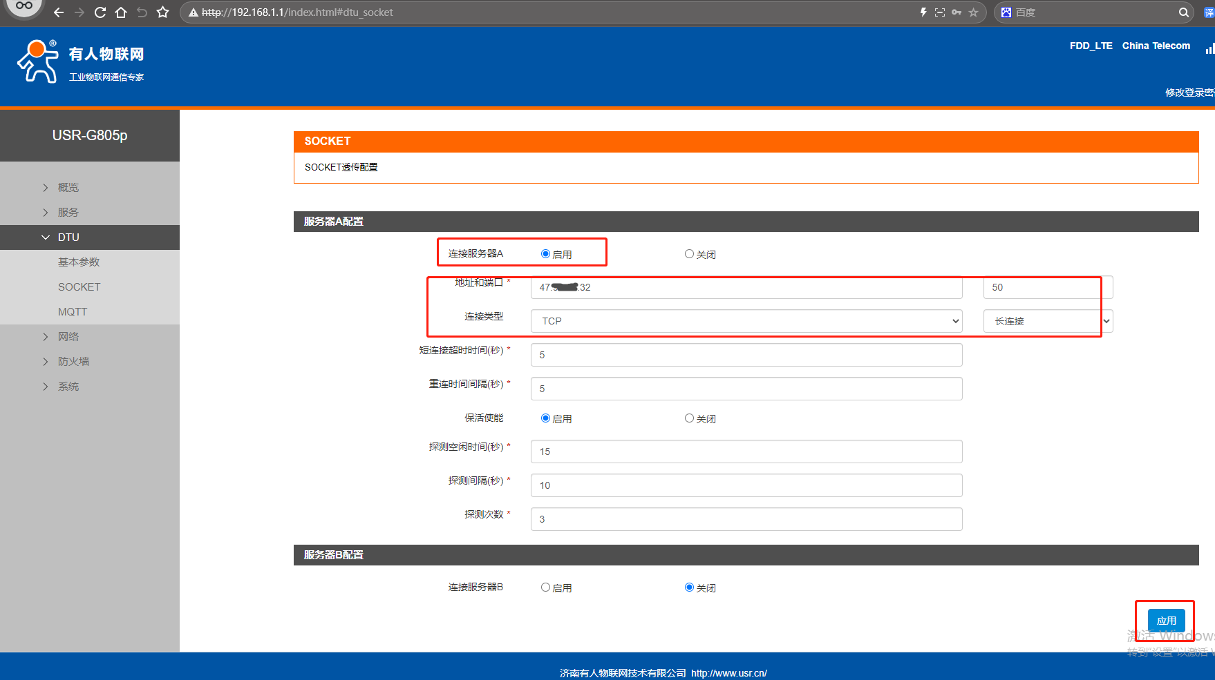 網頁點擊DTU,點擊SOCKET,連接服務器A,點擊啟用,地址填遠程服務器,端口號50,連接類型TCP,長連接。點擊應用。