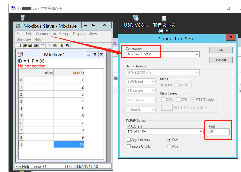 2、Modbus Slave軟件,點擊Connection,選擇Modbus TCP/IP,TCP/IP Server IP Address填遠程服務器對應的服務器地址IP,Port端口50。最后點擊OK。