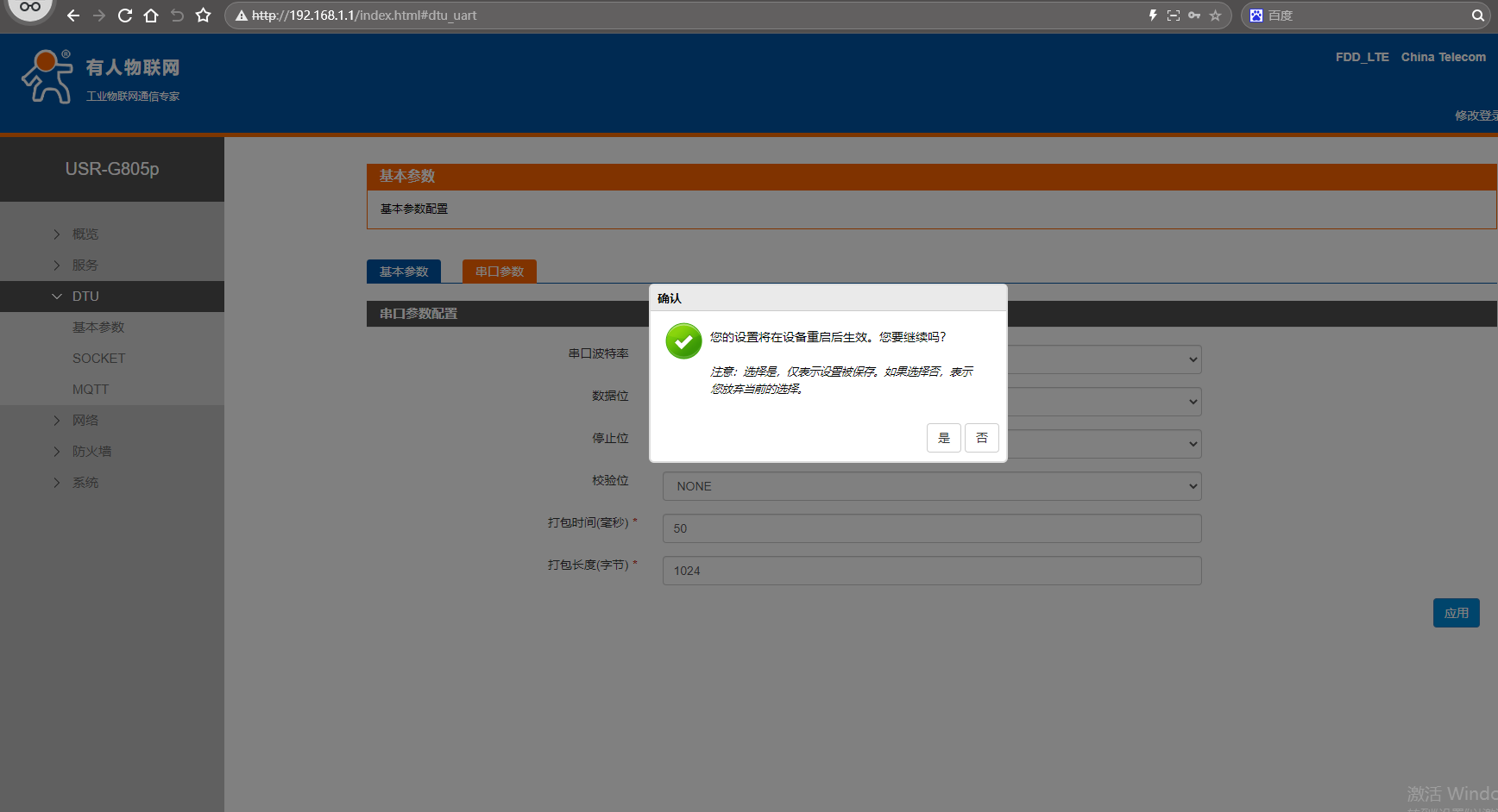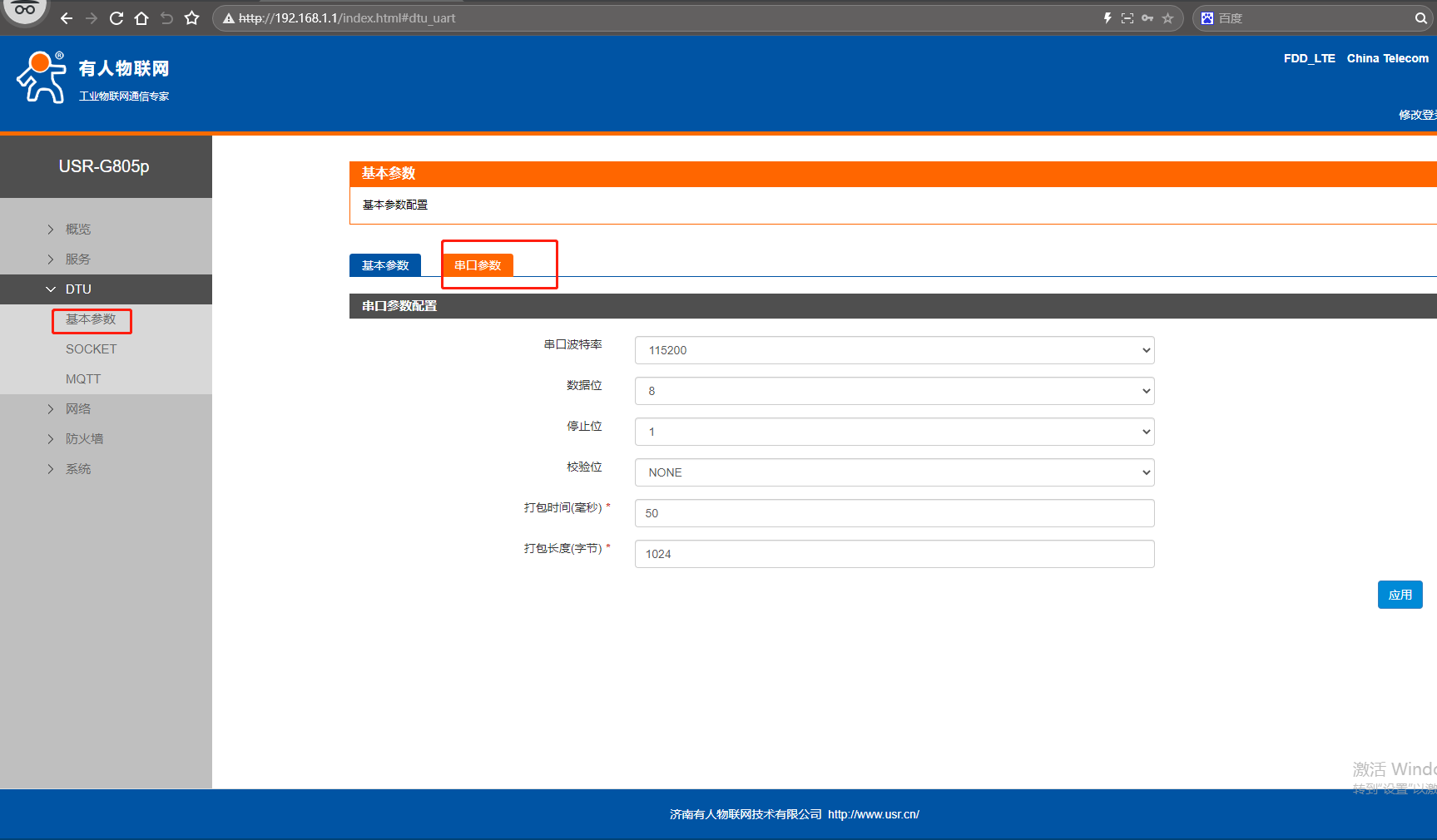 網頁點擊DTU,點擊基本參數,串口參數保持默認,實際應用接實際485串口設備的時候,需要和所接485串口設備的串口參數一致。點擊應用。