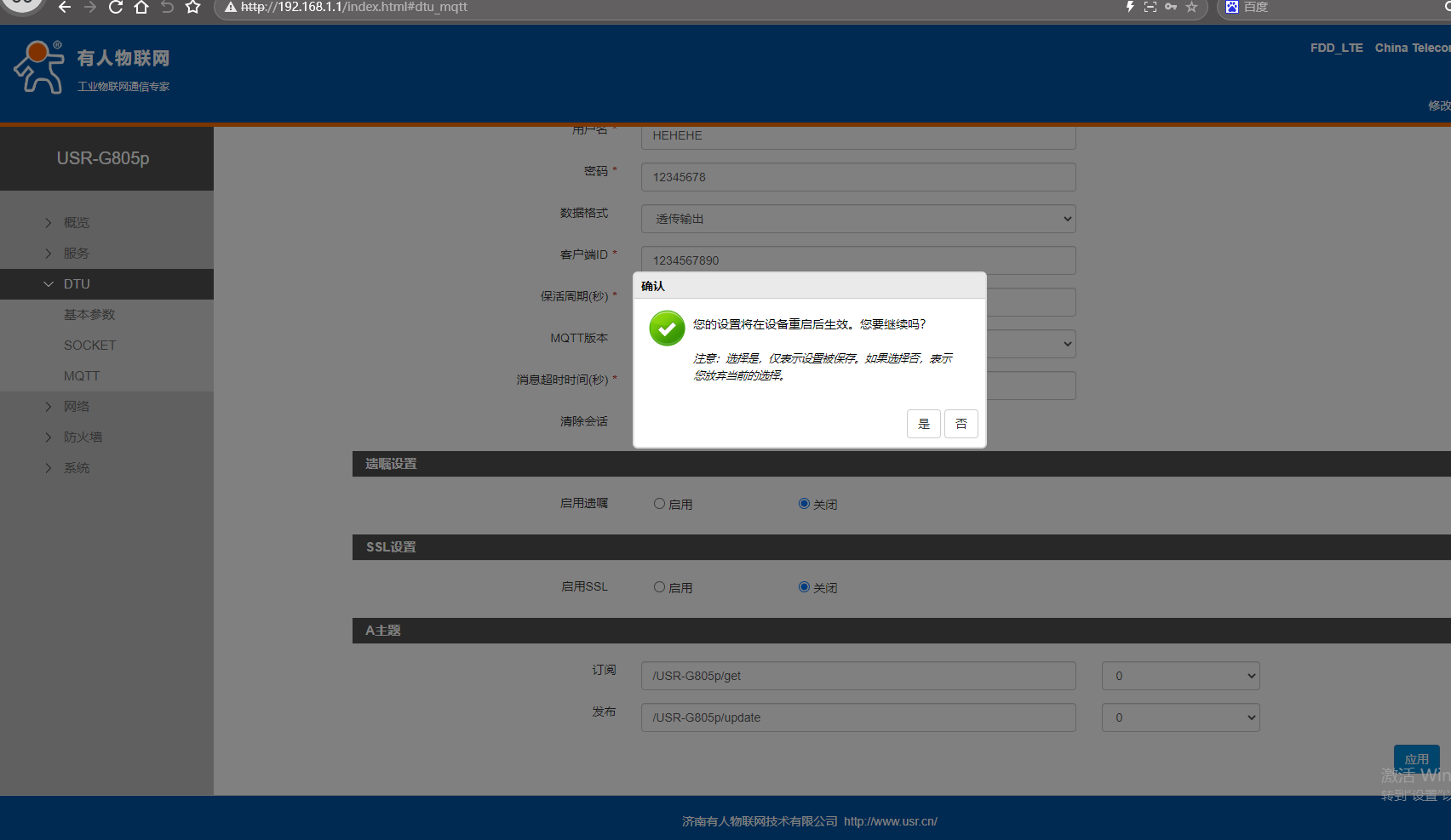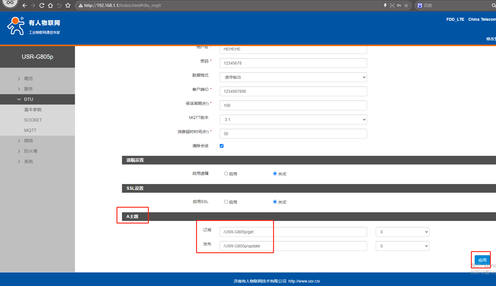 (2)A主題,訂閱填寫/USR-G805p/get,發布填寫/USR-G805p/update。
