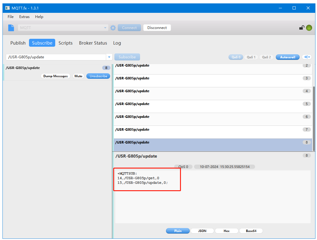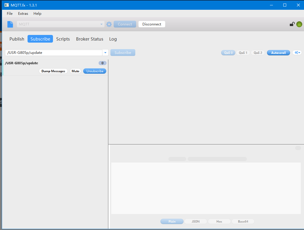 (2)MQTT.fx軟件點擊Subscribe,輸入/USR-G805p/update,點擊后面的Subscribe。